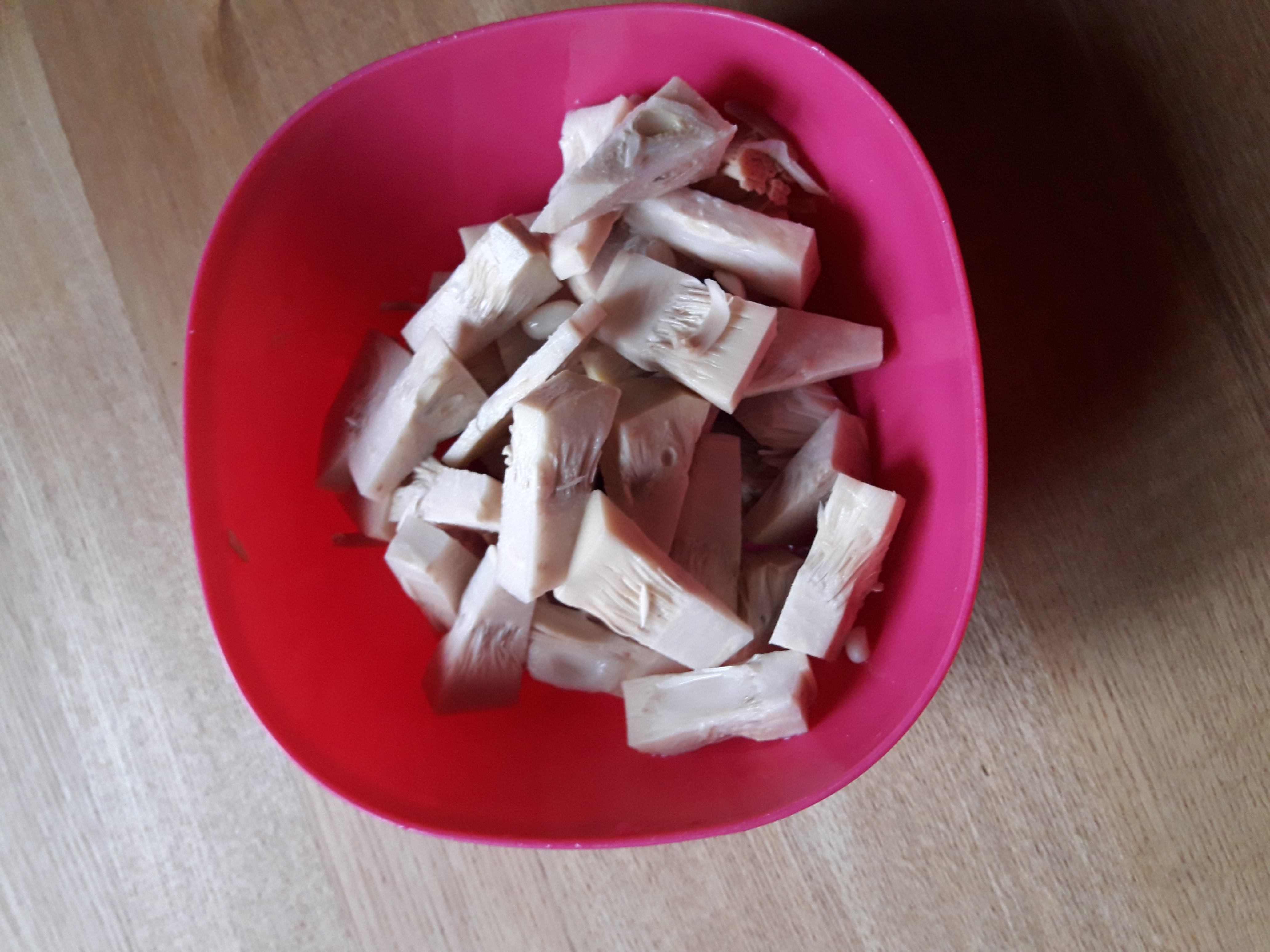 Questo frutto nella versione in salamoia ha la consistenza della carne di maiale. L'ho marinato con spezie e salsa di soia per una notte e poi l'ho saltato in padella. Buono, ma l'unico mio dubbio è relativo ai principi nutritivi. Ha la consistenza della carne ma non ha proteine, quindi non riesco a collocarlo nella mia dieta e non credo che lo ricomprerò.