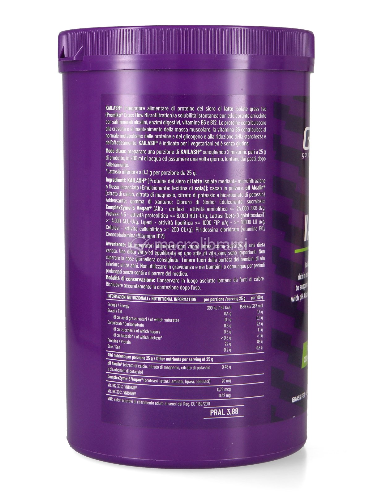 KAILASH® integratore alimentare di proteine del siero di latte isolate grass fed (Promiko® Cross Flow Microfiltration) a solubilità istantanea con edulcorante arricchito con sali minerali alcalini, enzimi digestivi, vitamine B6 e B12.