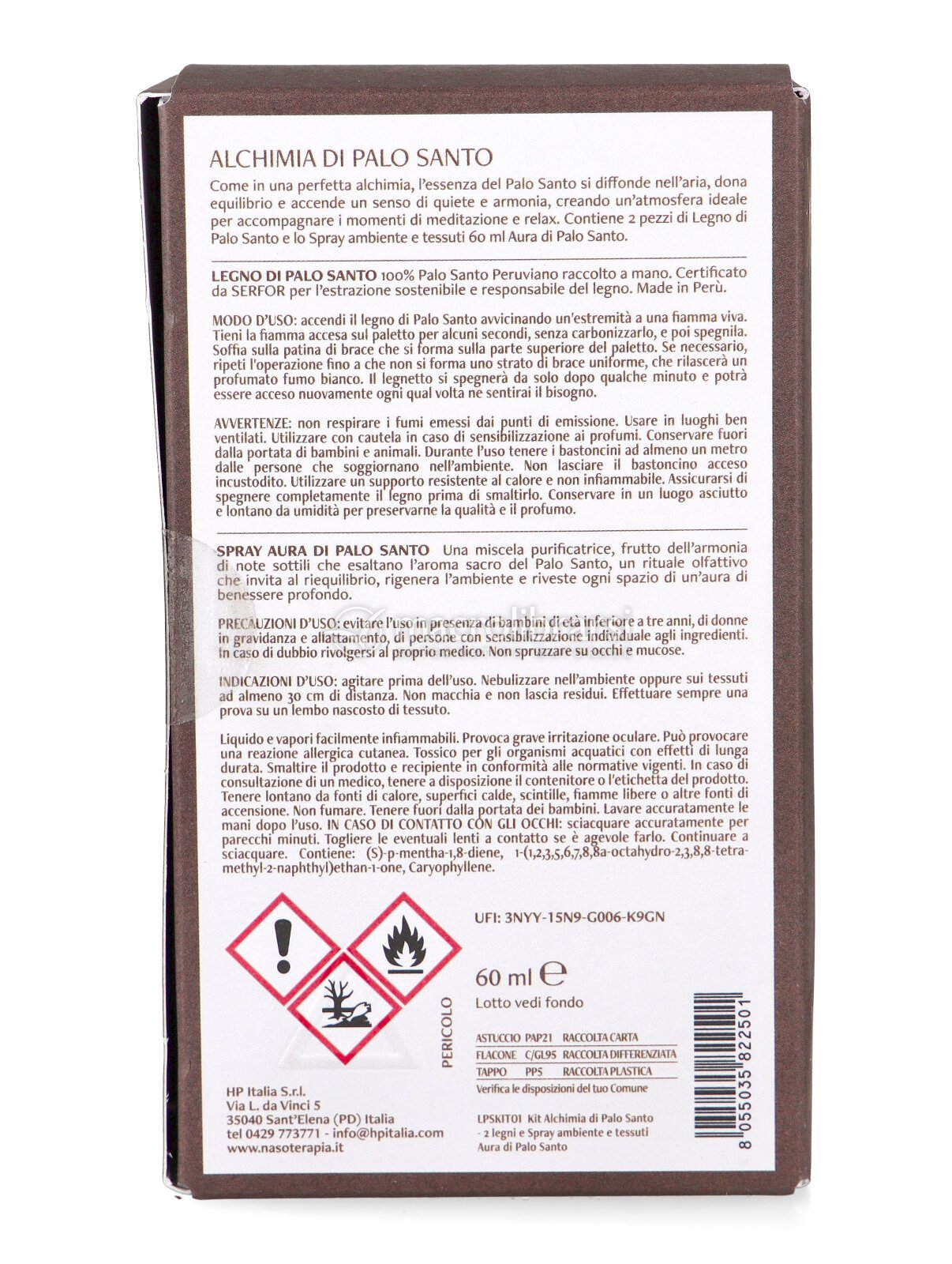 Il Kit Alchimia di Palo Santo - Spray e Legno Naturale di Nasoterapia è un cofanetto che contiene un flacone da 60 ml di spray ambiente e tessuti e due legni di Palo Santo.