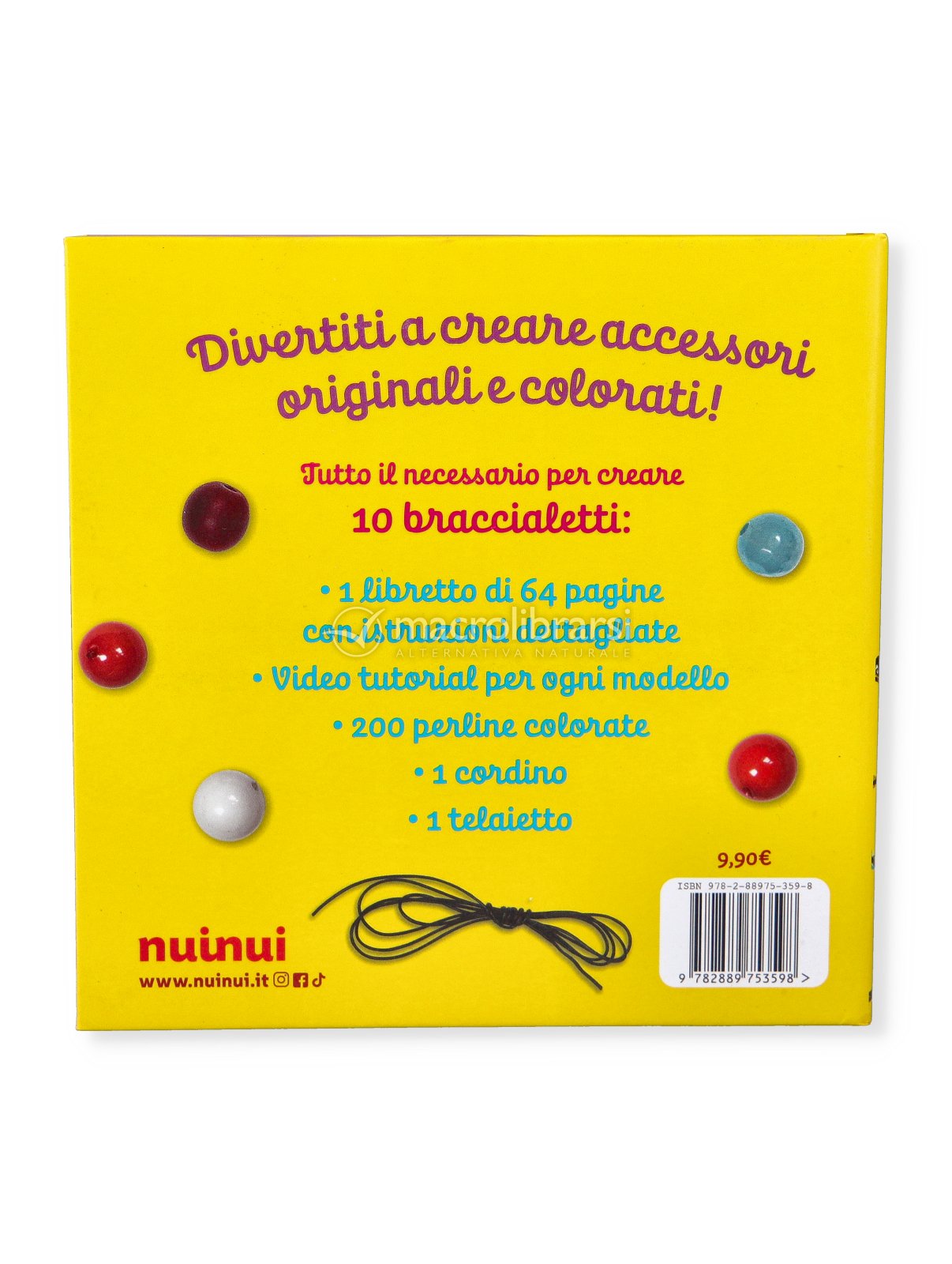 Il cofanetto contiene 200 perline colorate, un cordino, un telaietto e un libretto di 64 pagine con istruzioni dettagliate e i codici QR per vedere i video tutorial.