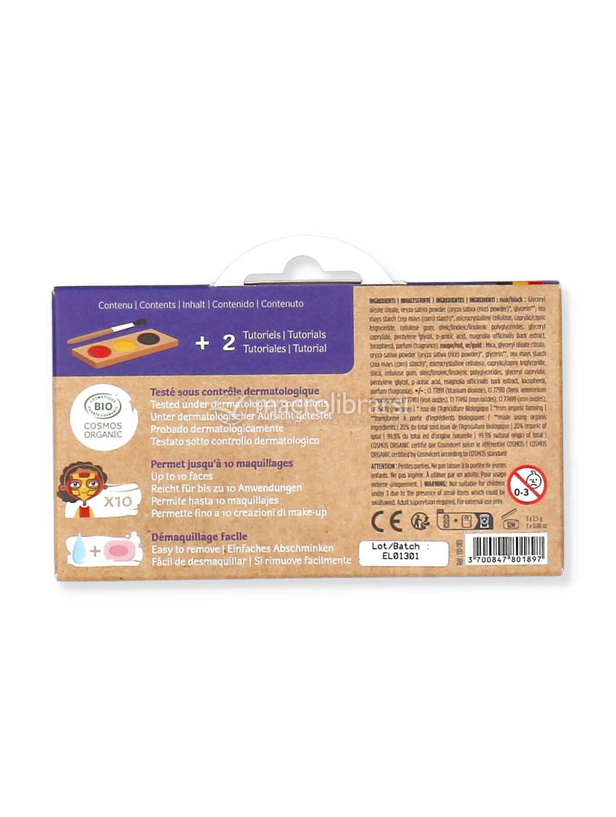 Trasformati in un misterioso ninja o in coraggioso supereroe con questa palette composta da 3 ombretti colorati (rosso, oro, nero) a base d'acqua, certificati biologici e ipoallergenici.