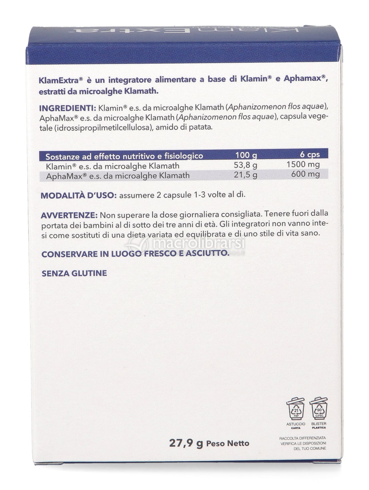 Klamin® e.s. da microalghe Klamath (Aphanizomenon flos aquae), AphaMax® e.s. da microalghe Klamath (Aphanizomenon flos aquae), capsula vegetale (idrossipropilmetilcellulosa), amido di patata.