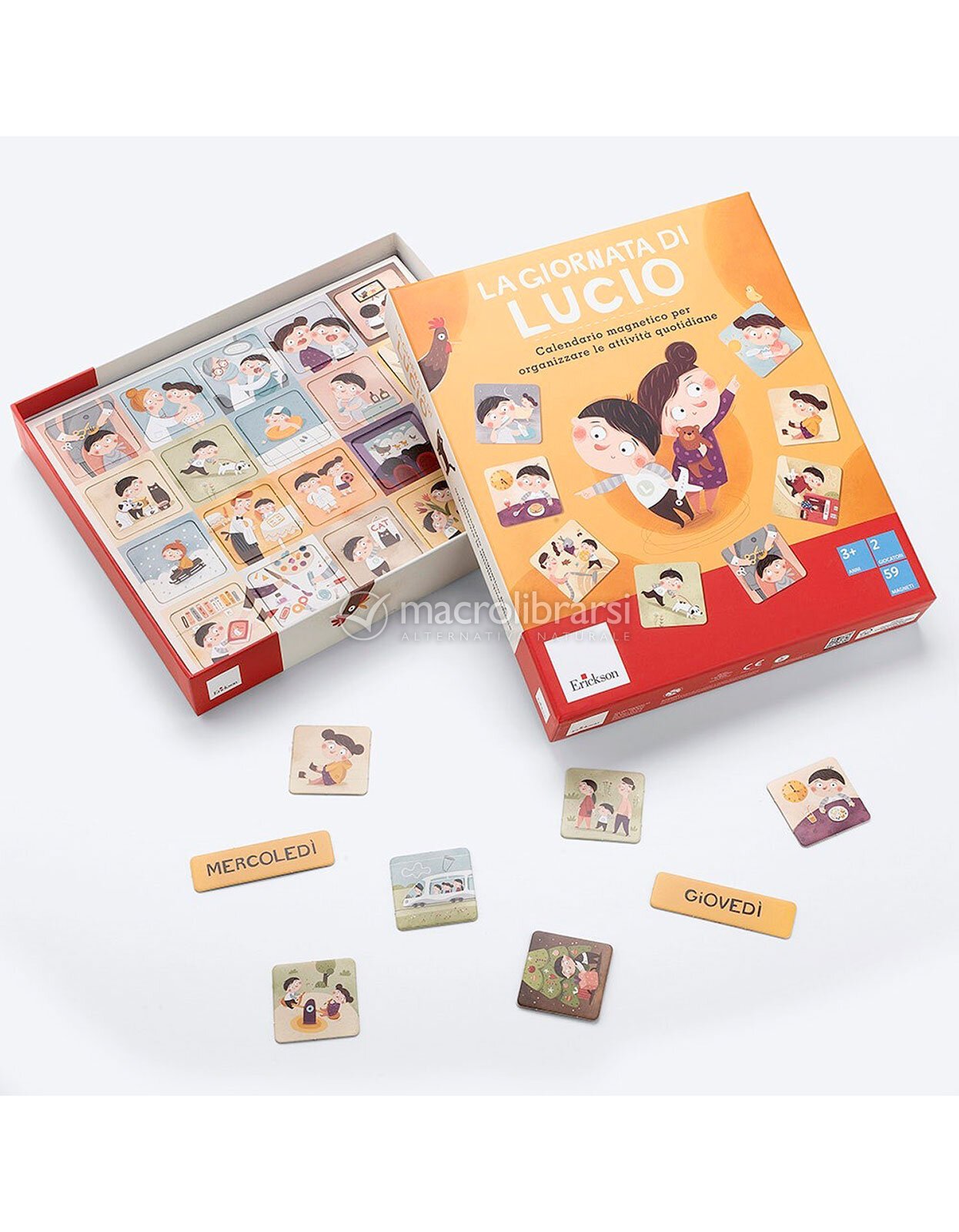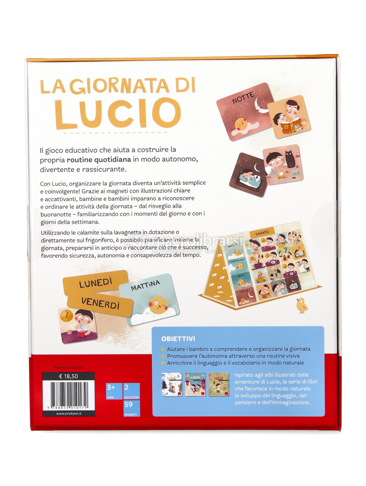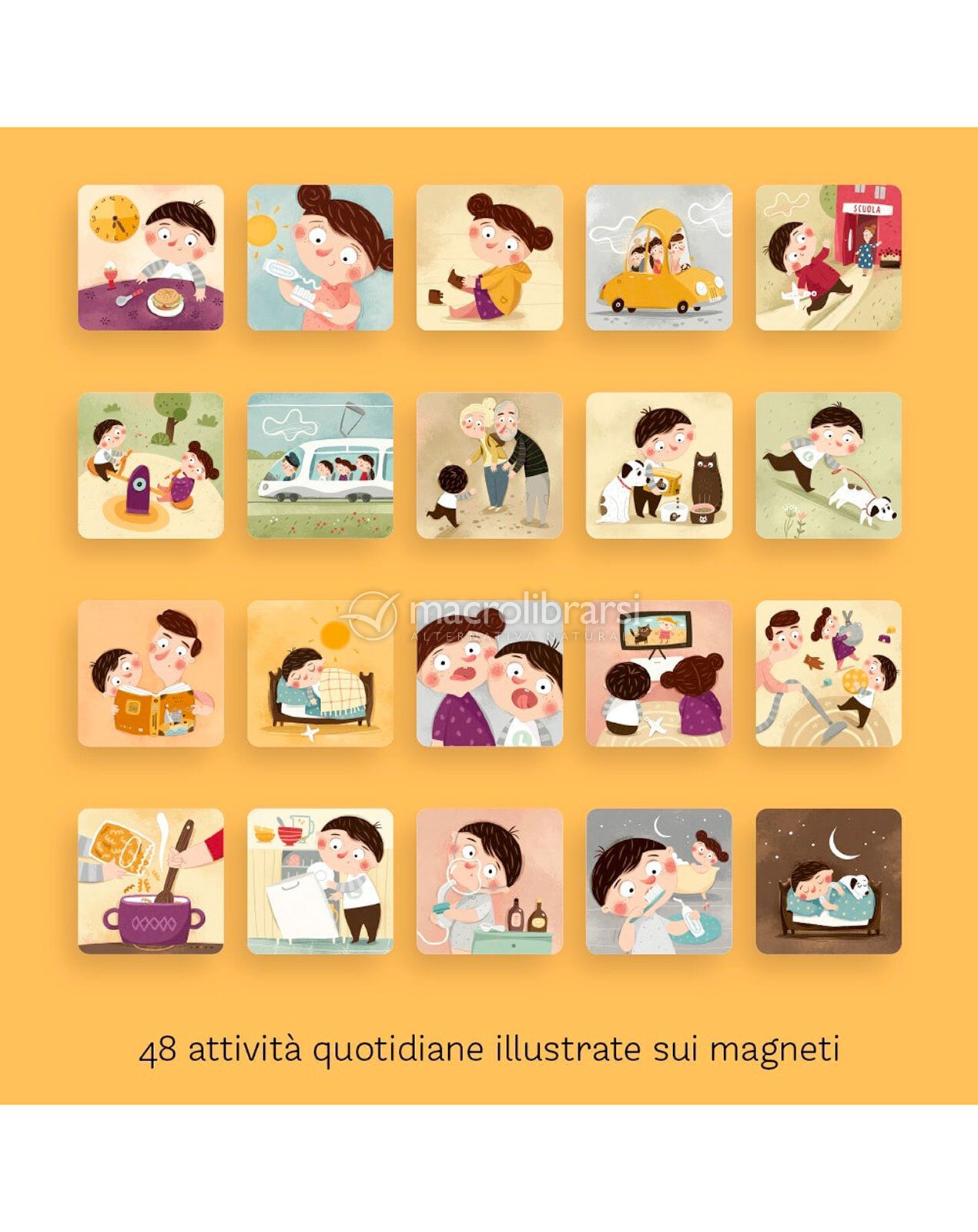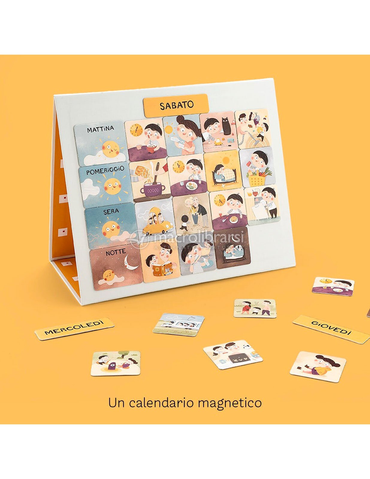 Attraverso magneti illustrati chiari e intuitivi, bambine e bambini possono riconoscere, ordinare e raccontare i diversi momenti della giornata, dal risveglio alla buonanotte, sviluppando una prima consapevolezza del tempo.
