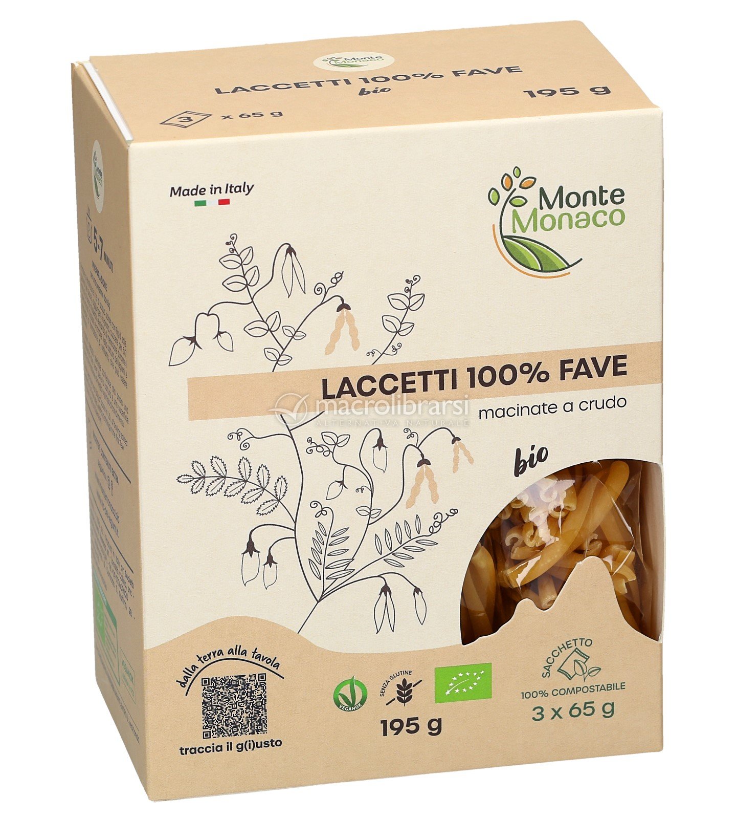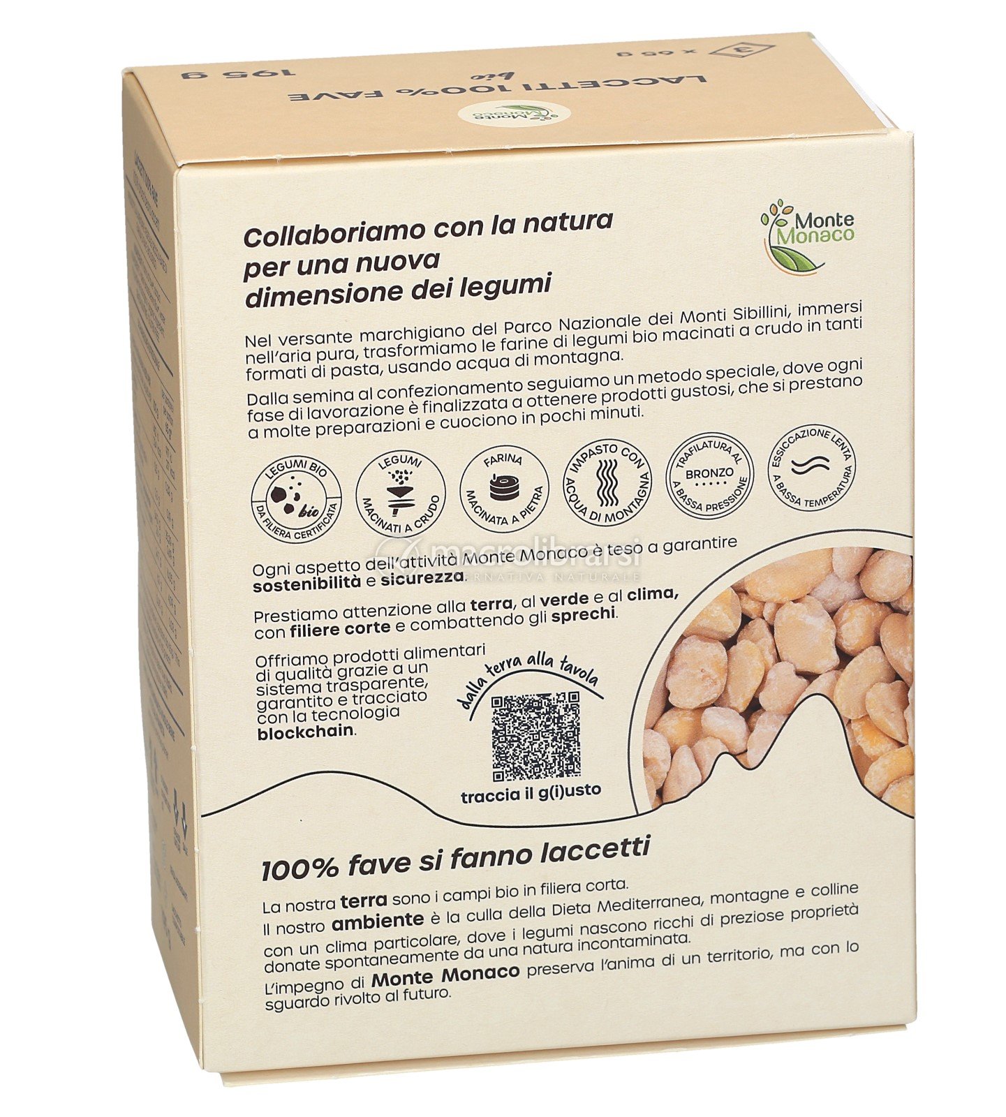 La tipica forma tradizionale della pasta di MonteMonaco è stata creata con la farina di fave 100% bio. La farina di fave è ricca di fibre e proteine, quasi senza grassi e soprattutto con tanti minerali, come il ferro di origine vegetale, un alimento particolarmente consigliato per le diete ipocaloriche.