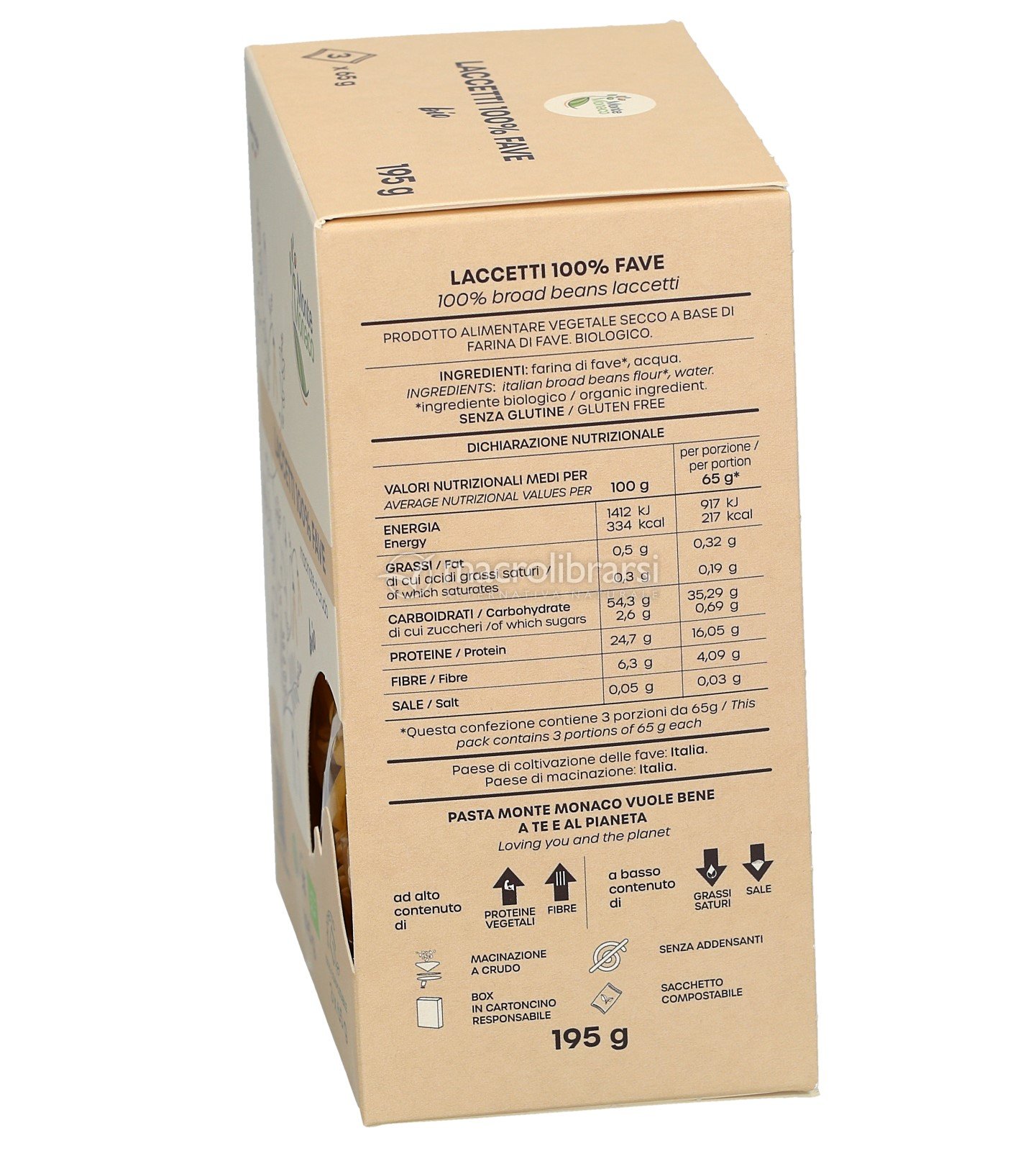 pasta di legumi migliore in italia....buonissima, non scuoce pacco diviso in porzioni comodissimo. nel pacco di sono tre porzioni. non sembra di mangiare una pasta di legumi.