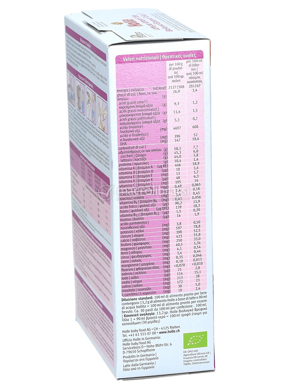 Diluizione standard: 100 ml di alimento pronto per bere contengono 13,2 g di alimento Holle a base di latte e 90 ml di acqua bollita = 100 ml di alimento pronto per essere bevuto.