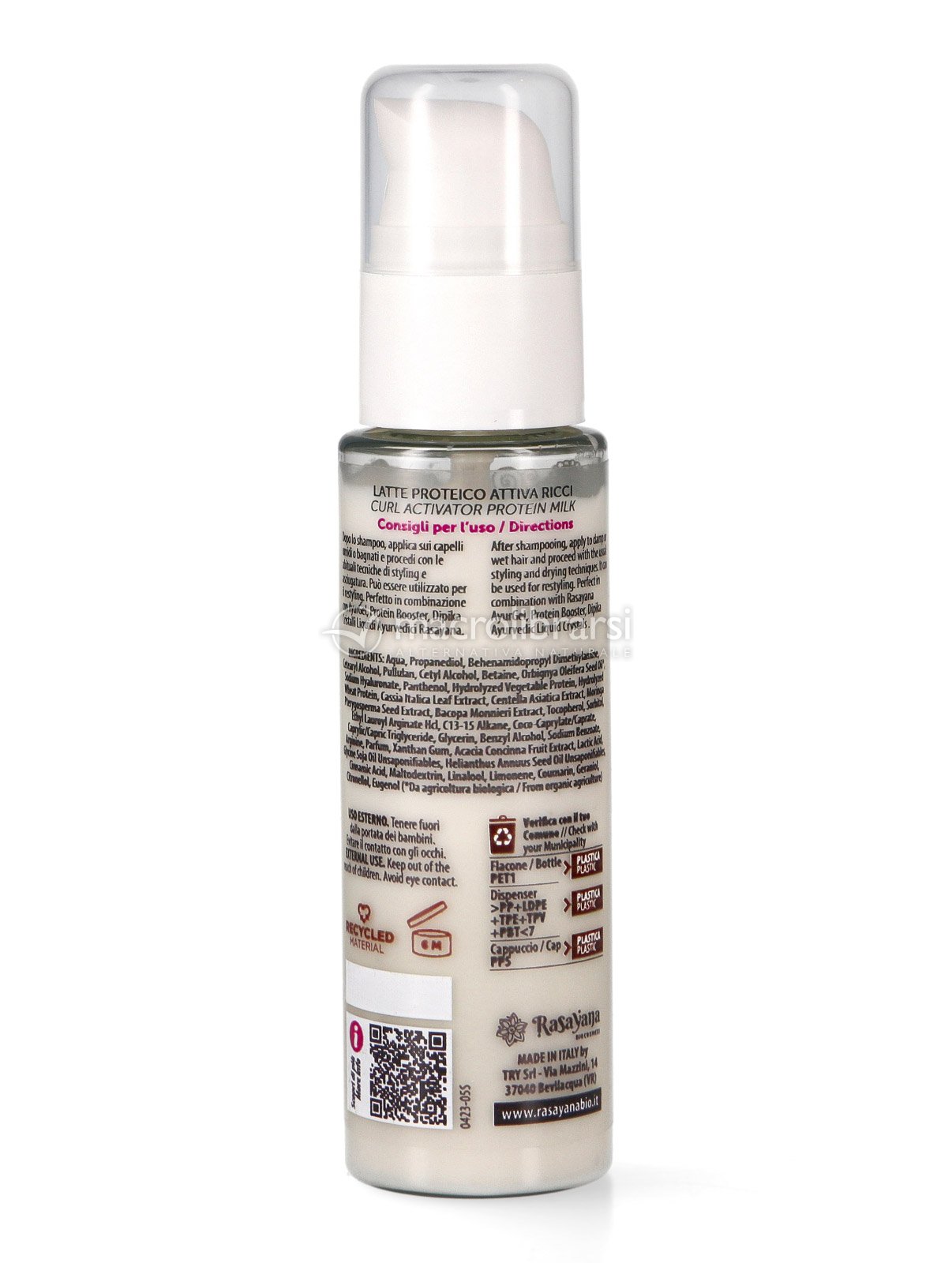 Il Latte Proteico Attiva Ricci Alaka di Rasayana è un latte leggero dal pH acido (3,5-3,9) ad azione anticrespo ideale per lo styling dei capelli ricci, mossi e afro.