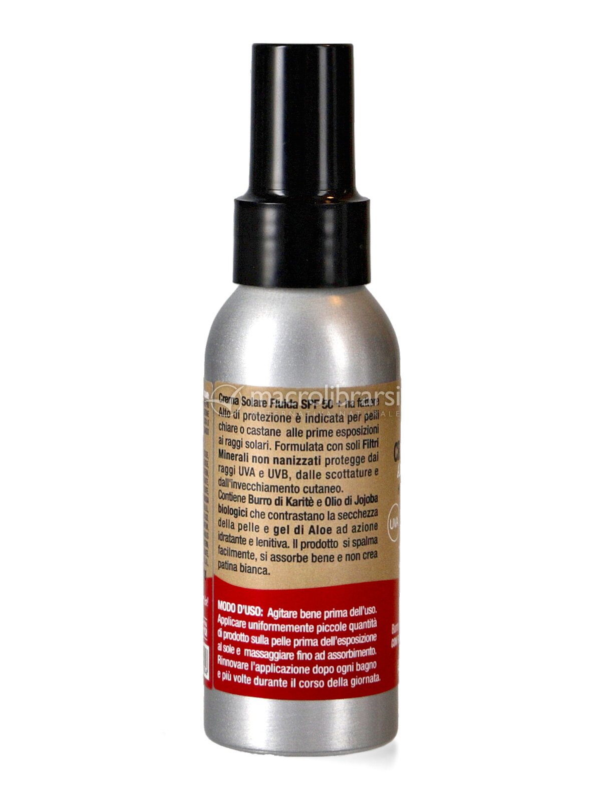 Crema solare fluida ad alto fattore di protezione SPF 50+, la protezione solare plastic free ideale per pelli chiare o castane alle prime esposizioni ai raggi solari.