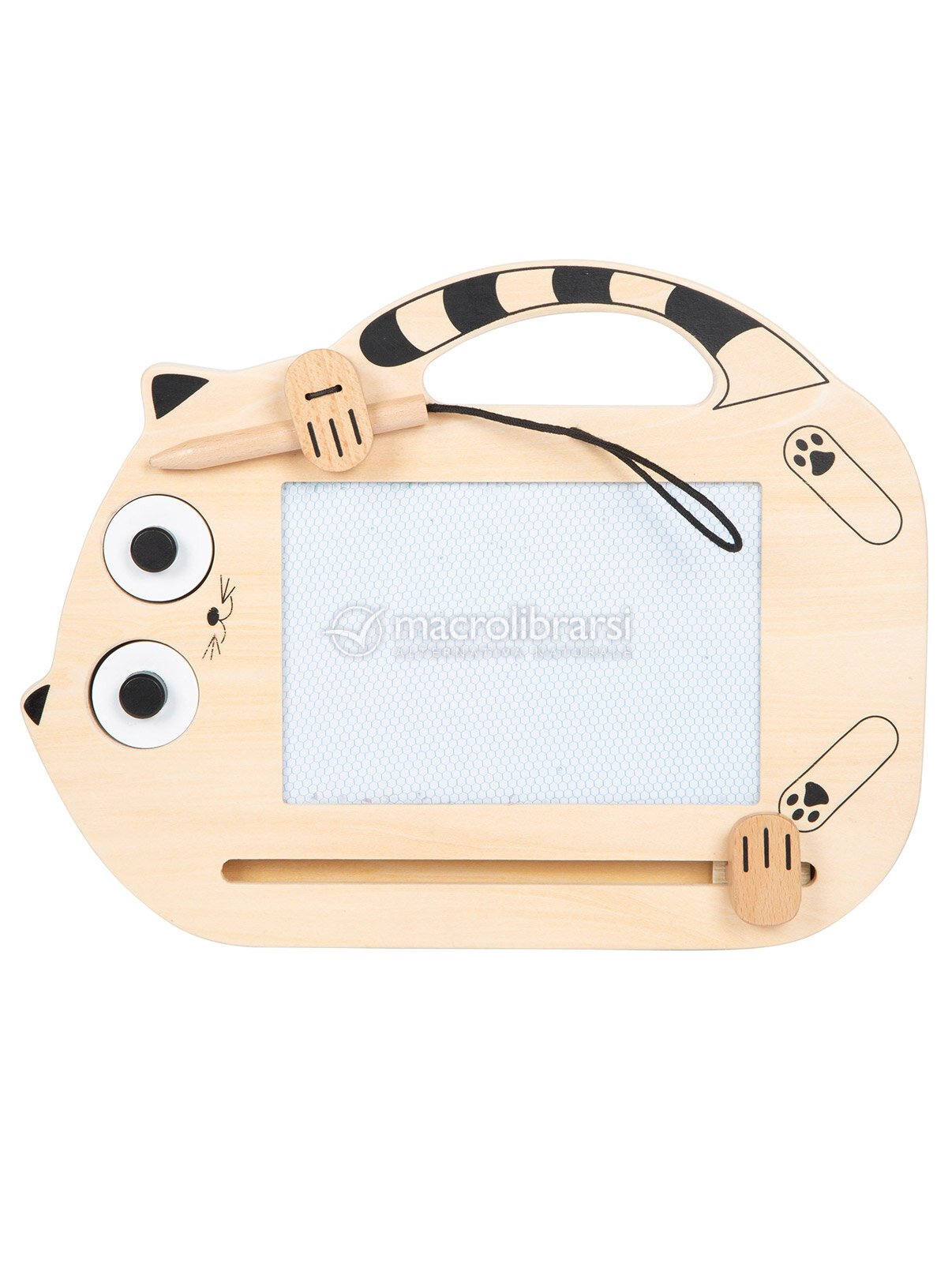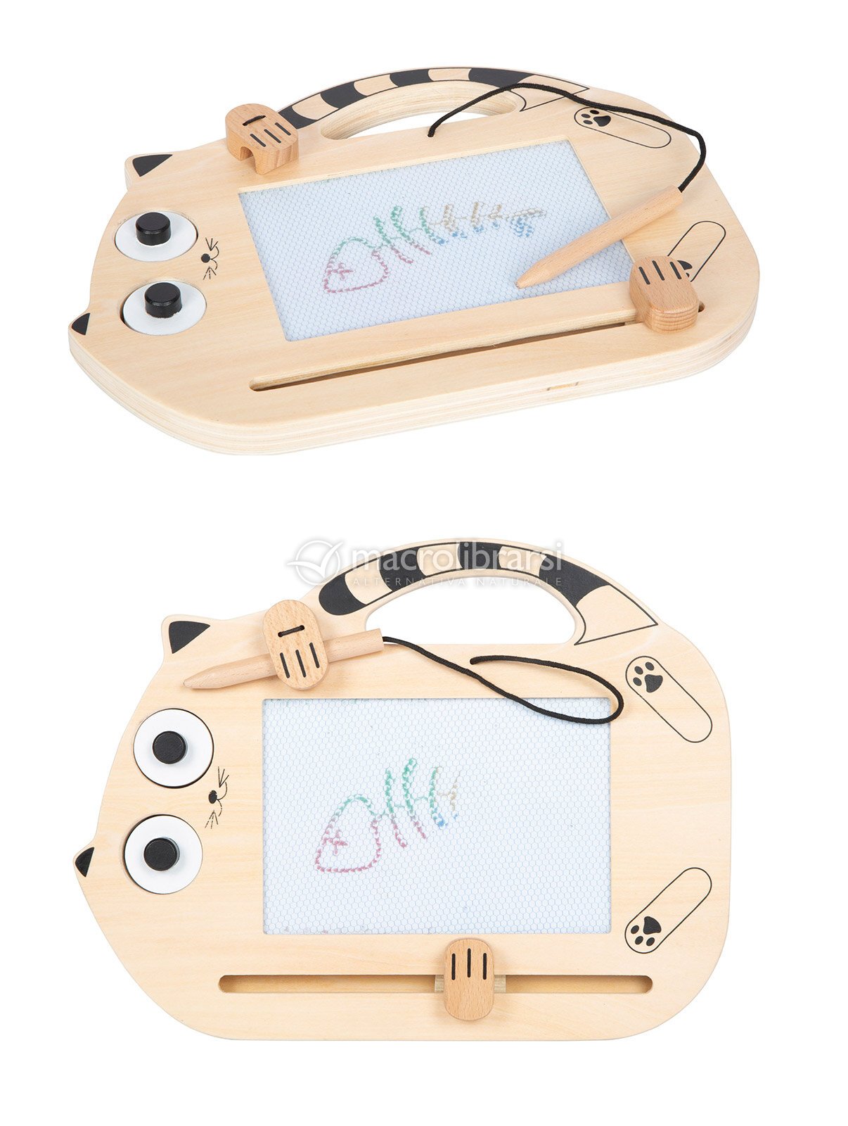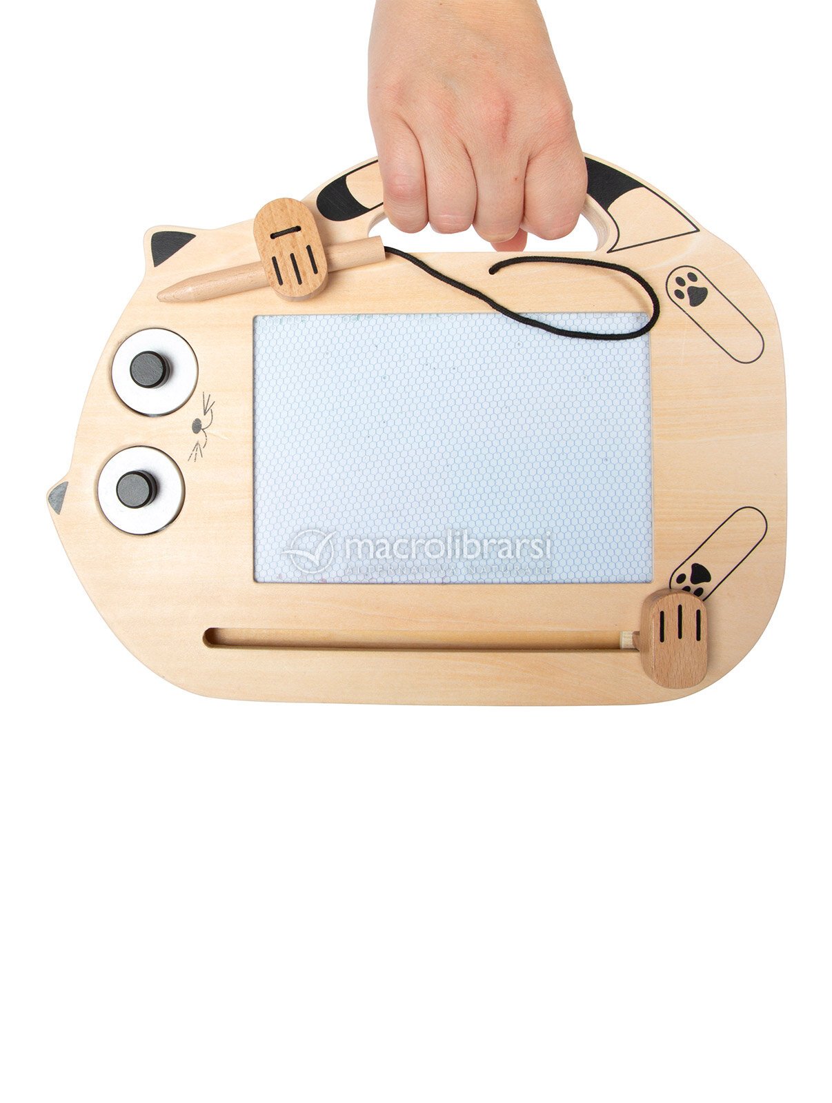 Lavagna magnetica in legno a forma di gatto per dipingere e disegnare, con penna e due timbri.