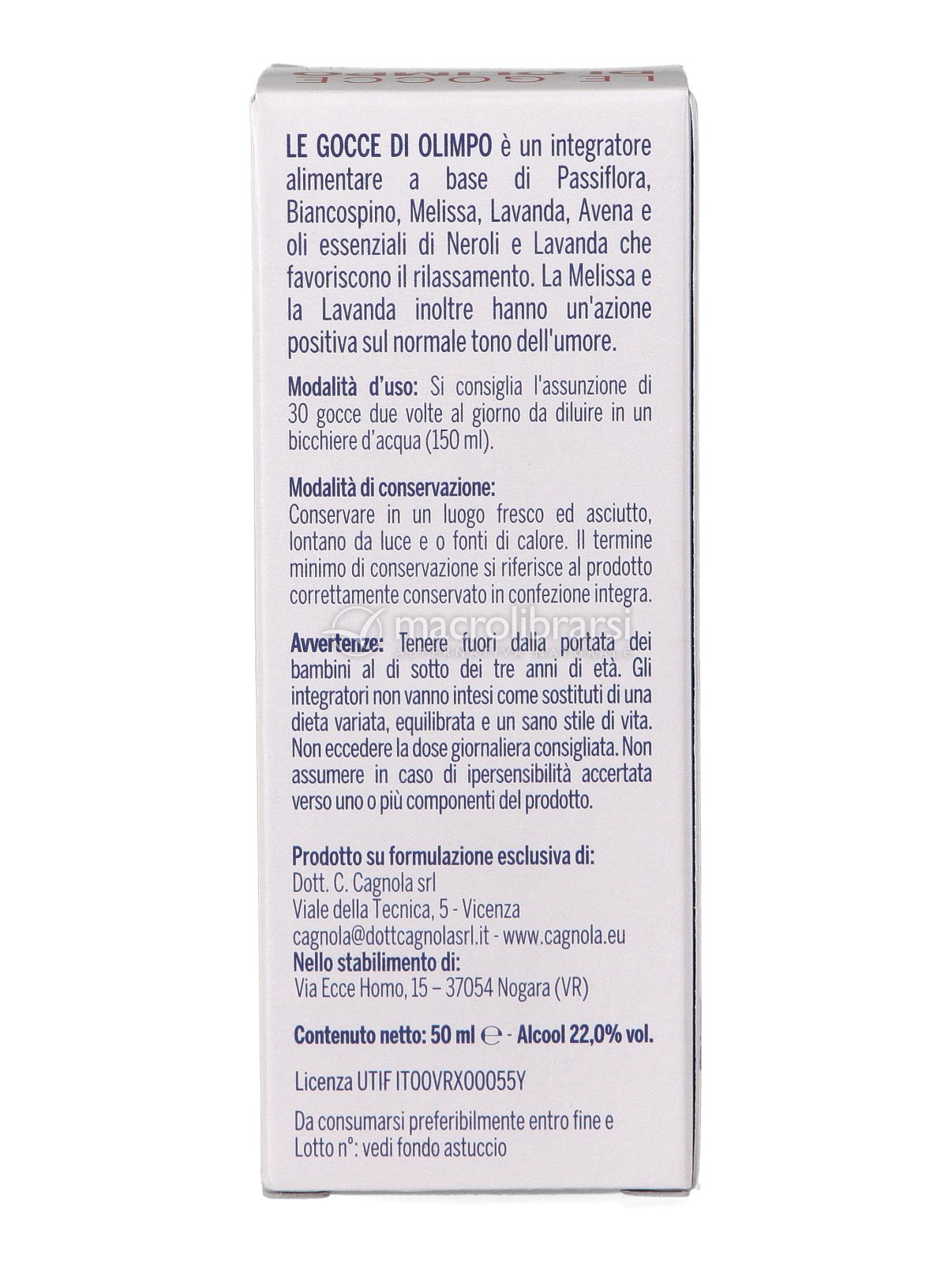 Le Gocce di Olimpo è un integratore alimentare in gocce a base di Melissa, Passiflora, Lavanda e Avena con olii essenziali di Neroli e Lavanda, utile per ritrovare la calma e favorire il rilassamento diurno. Contiene: