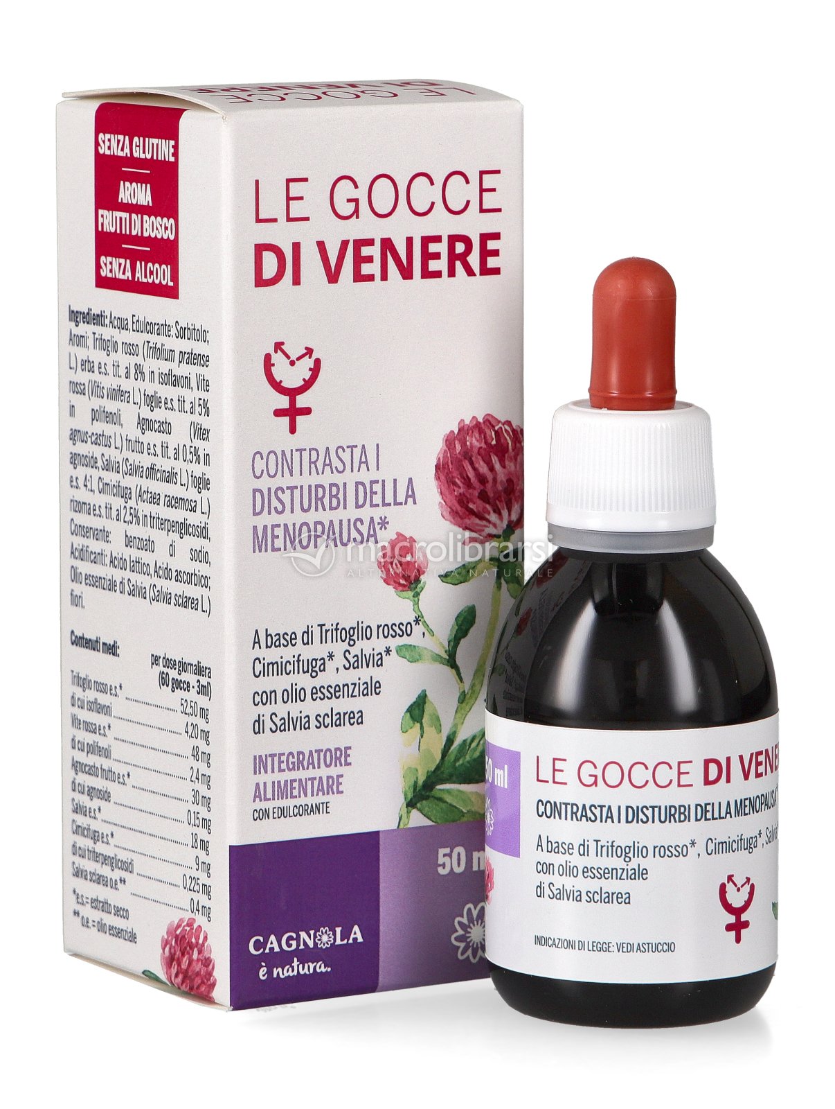 Le Gocce di Venere è un integratore liquido a base di Trifoglio rosso, Vite rossa, Agnocasto, Cimicifuga e Salvia, estratti vegetali utili per contrastare i disturbi tipici della menopausa, come: