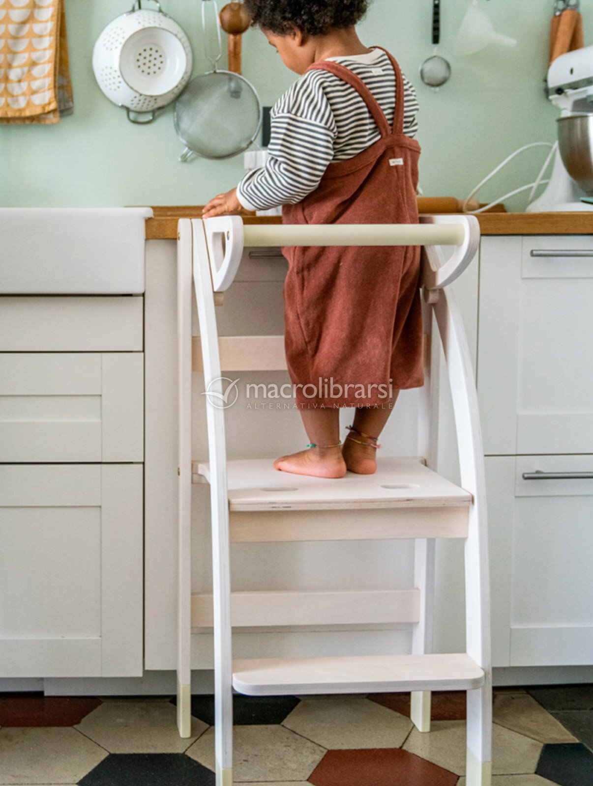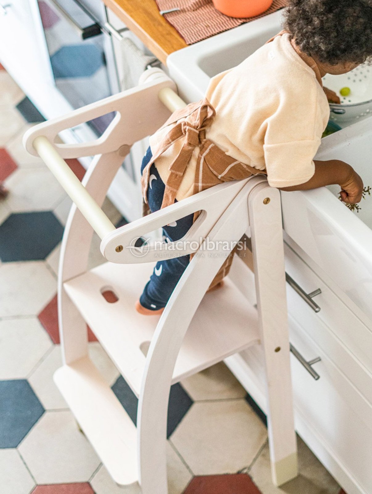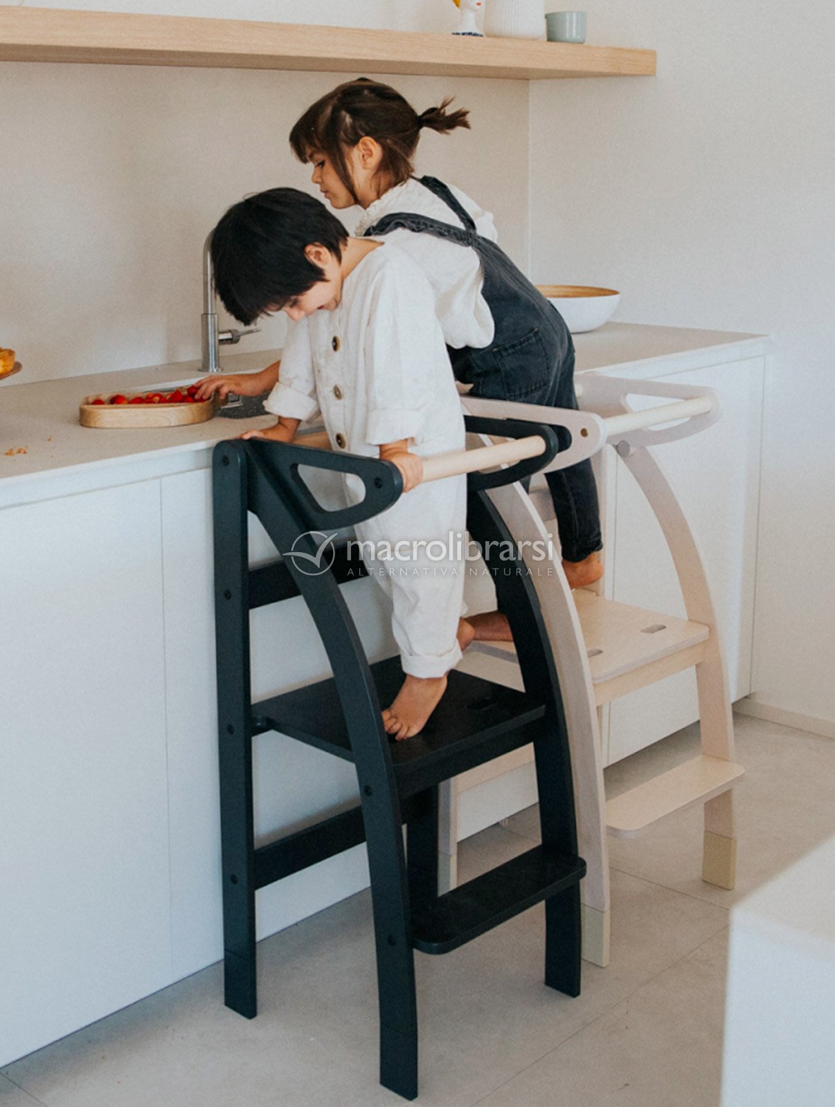 Pensata nei dettagli per agevolare i movimenti dei bimbi e per essere sicura nel suo uso quotidiano, si trasforma in una scaletta comodissima per gli adulti per raggiungere i ripiani alti della cucina (portata massima 80 kg).