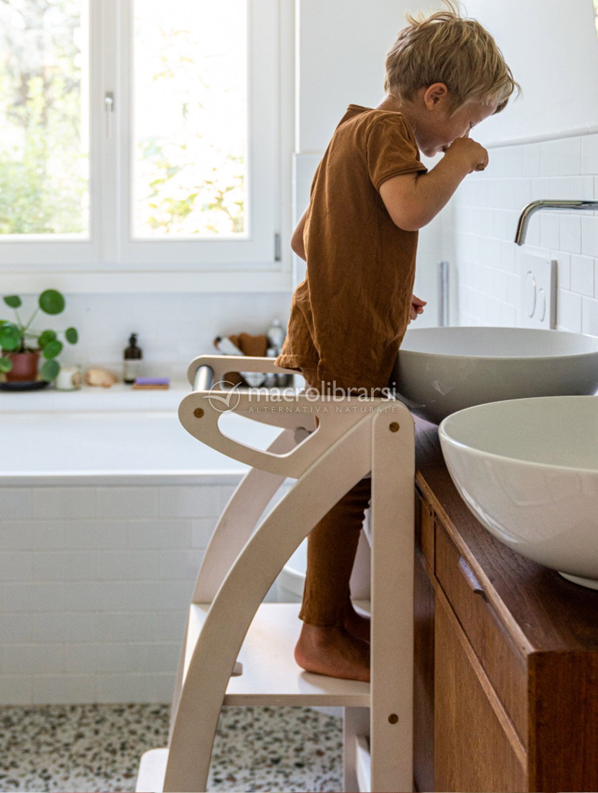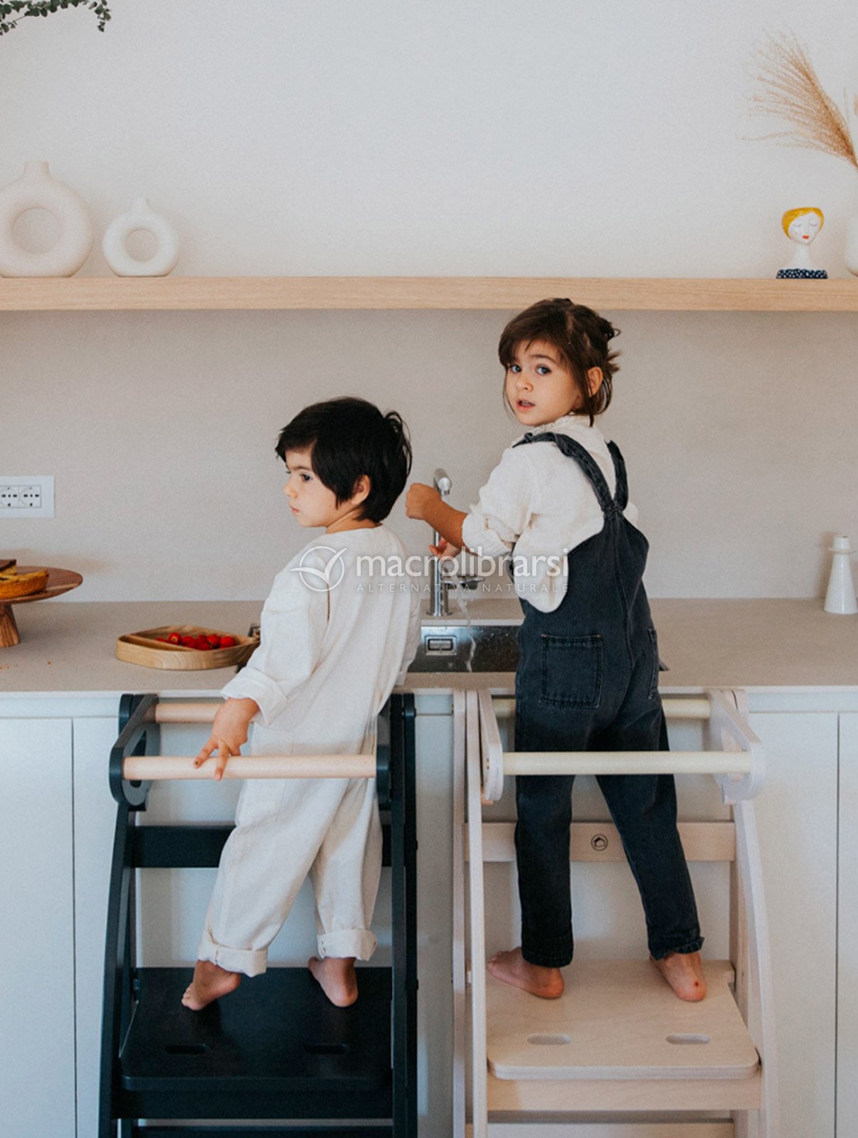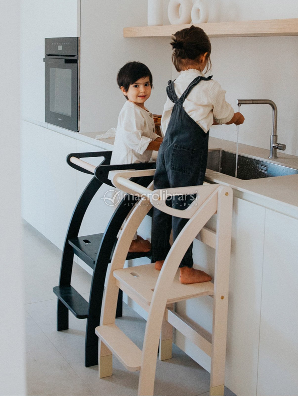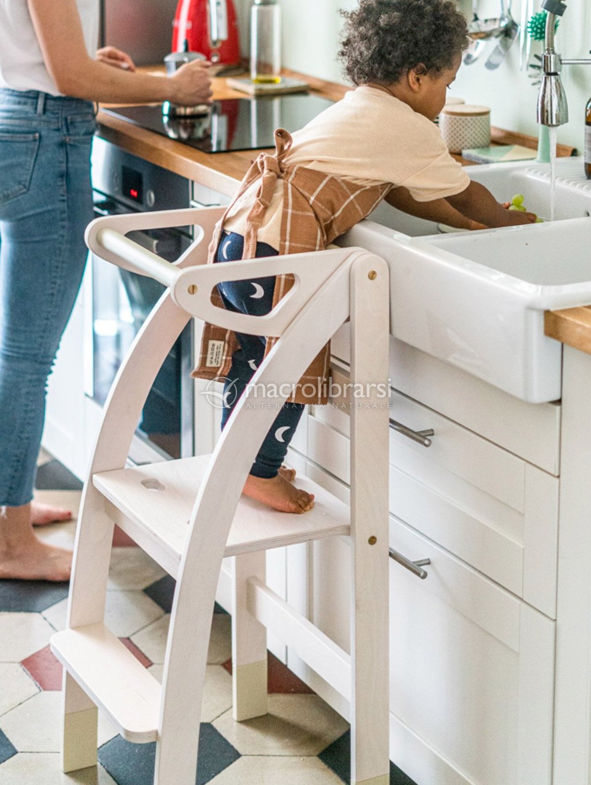 Pensata nei dettagli per agevolare i movimenti dei bimbi e per essere sicura nel suo uso quotidiano, si trasforma in una scaletta comodissima per gli adulti per raggiungere i ripiani alti della cucina (portata massima 80 kg).