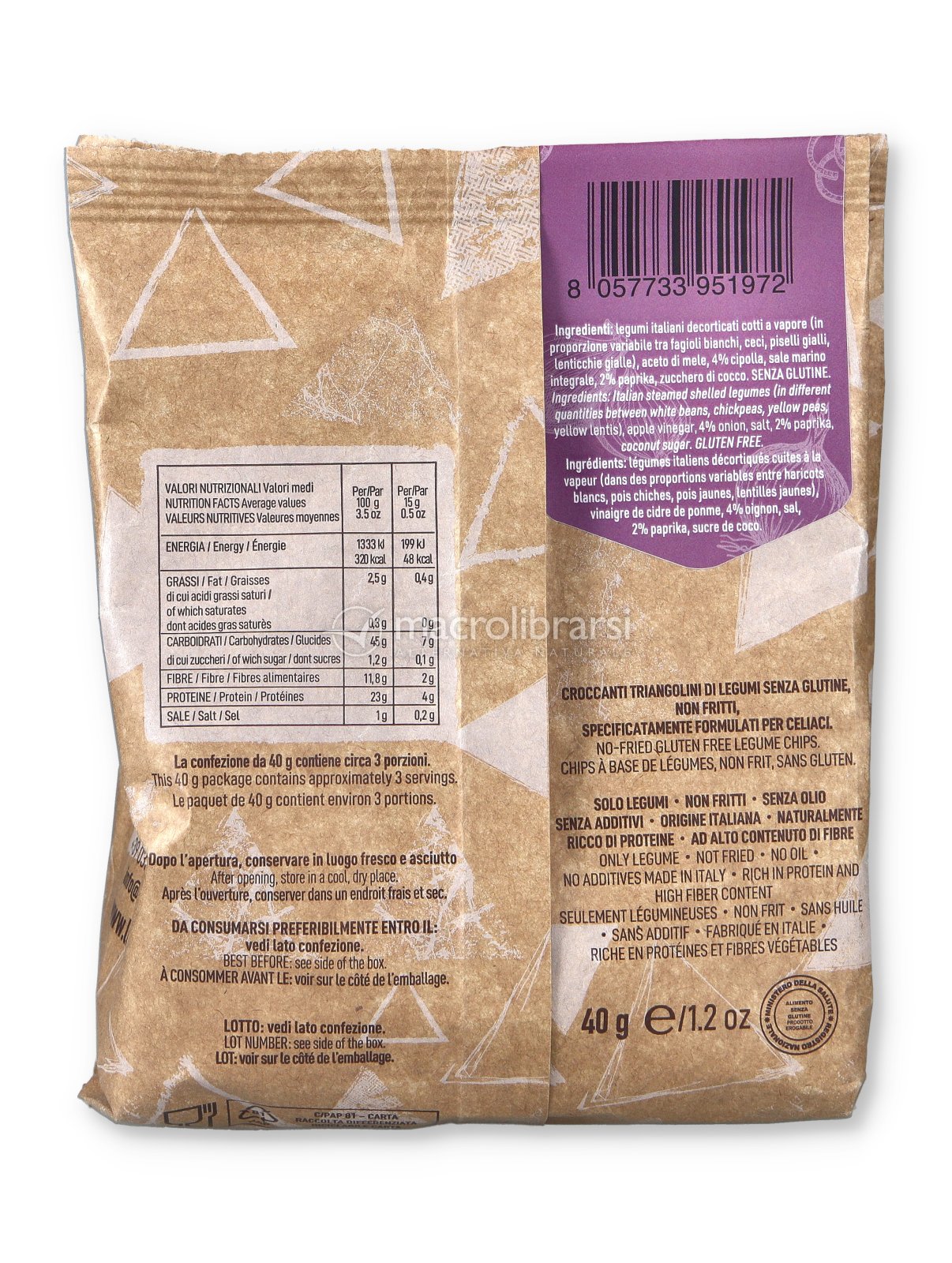 I triangolini di legumi con Cipolla e Paprika di LEGÙ® sono uno snack sano e leggero, non sono fritti con olio e non contengono glutine perché realizzati con soli legumi italiani.