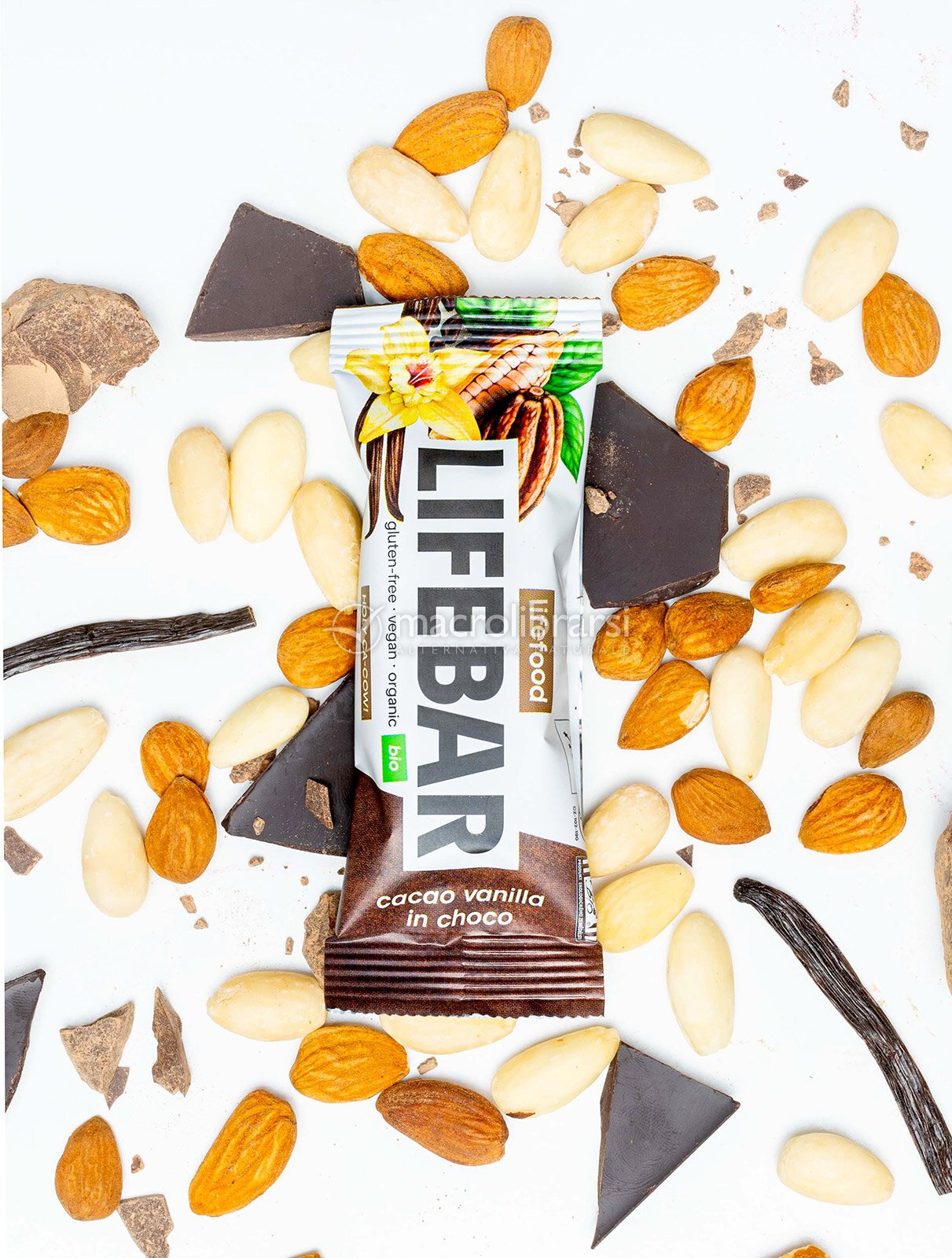 Una piacevole combinazione di fave di cacao non torrefatto, con vaniglia e noce moscata, ricoperta da una glassa al cioccolato al 70%.
