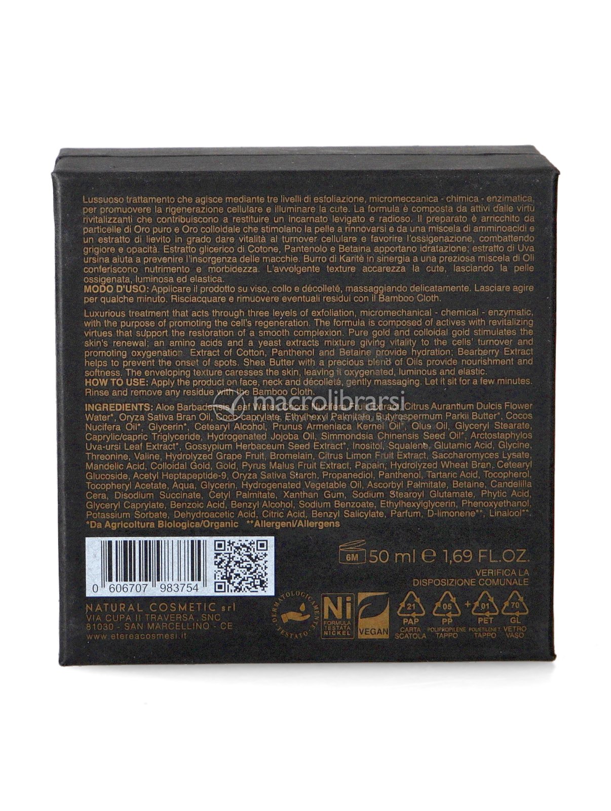 Peeling viso arricchito con oro puro ed oro colloidale, un trattamento che sfrutta tre tipi di esfoliazione - micromeccanica, chimica ed enzimatica - per promuovere la rigenerazione cellulare e illuminare la pelle.
