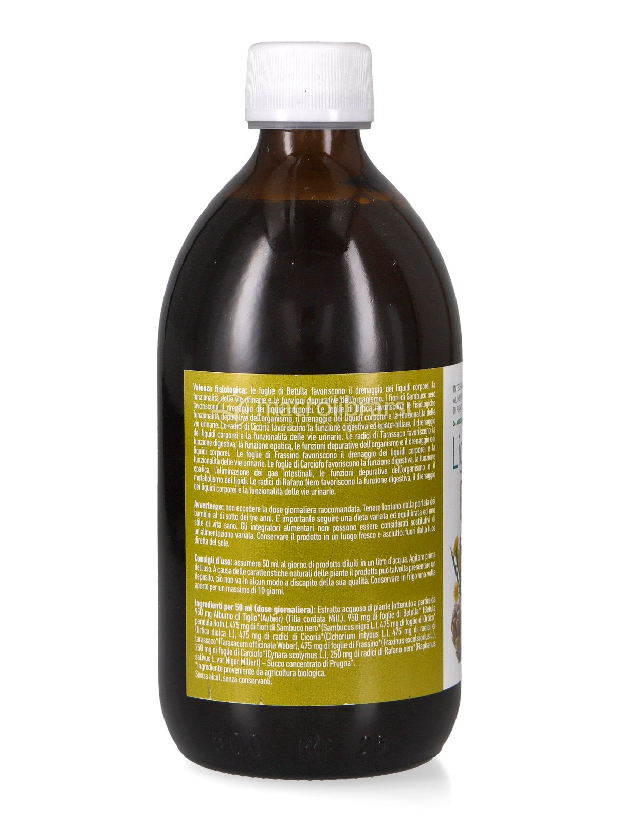 Estratto acquoso di piante [ottenuto a partire da 950 mg Alburno di Tiglio*(Aubier) (Tilia cordata Mill.), 950 mg di foglie di Betulla* (Betula pendula Roth.), 475 mg di fiori di Sambuco nero*(Sambucus nigra L.), 475 mg di foglie di Ortica* (Urtica dioica L.), 475 mg di radici di Cicoria*(Cichorium intybus L.), 475 mg di radici di tarassaco*(Taraxacum officinale Weber), 475 mg di foglie di Frassino*(Fraxinus excelsiorius L.), 250 mg di foglie di Carciofo*(Cynara scolymus L.), 250 mg di radici di Rafano nero*(Raphanus sativus L. var Niger Miller)] – Succo concentrato di Prugna*. *Ingrediente proveniente da agricoltura biologica.