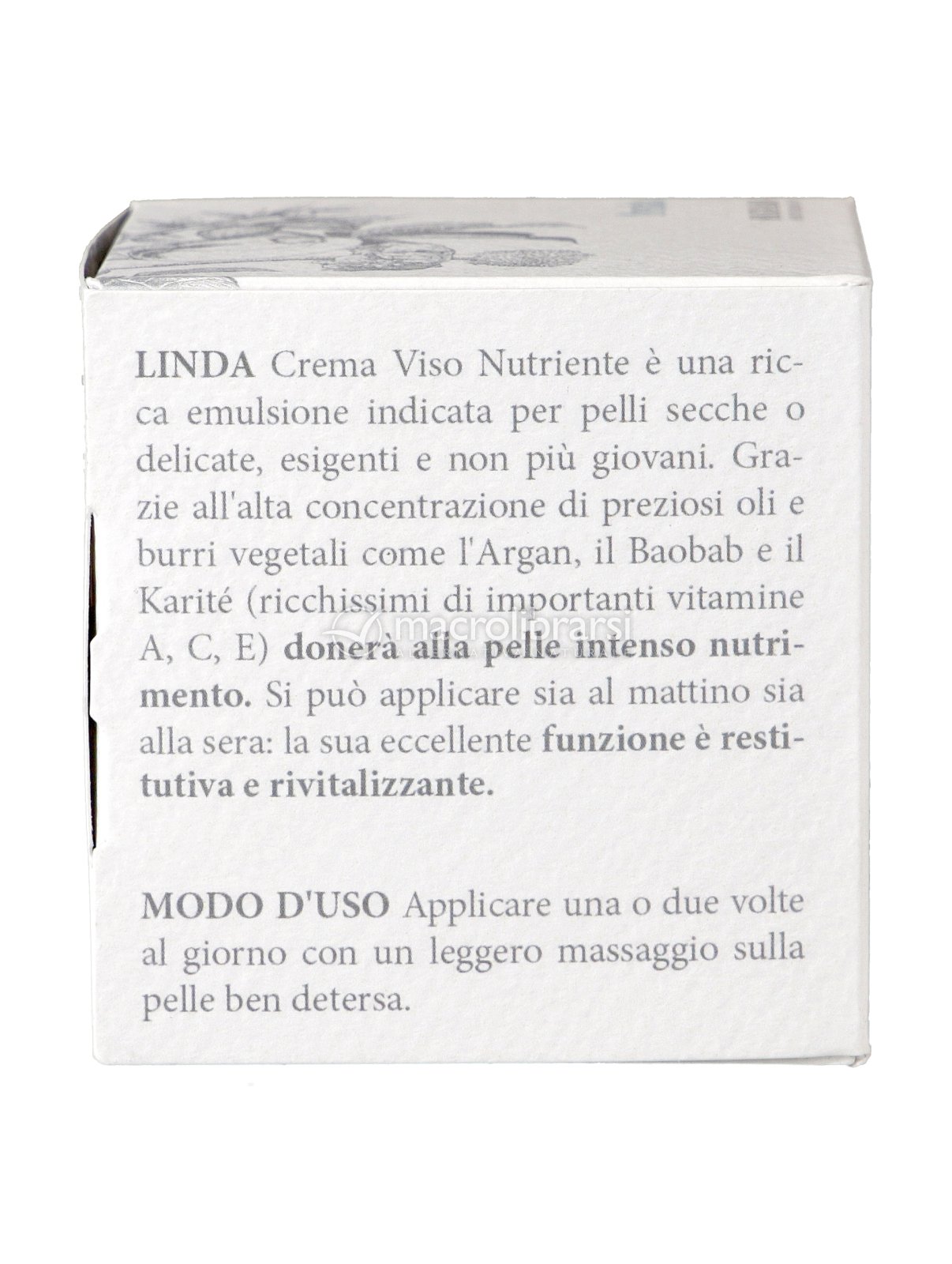 Grazie all'alta concentrazione di preziosi ingredienti vegetali come olio di Argan, olio di Baobab e burro di Karité, ricchissimi di importanti vitamine A, C ed E, la crema viso Linda dona alla pelle un nutrimento intenso, svolgendo un'eccellente funzione restitutiva e rivitalizzante sulla pelle secca e matura.