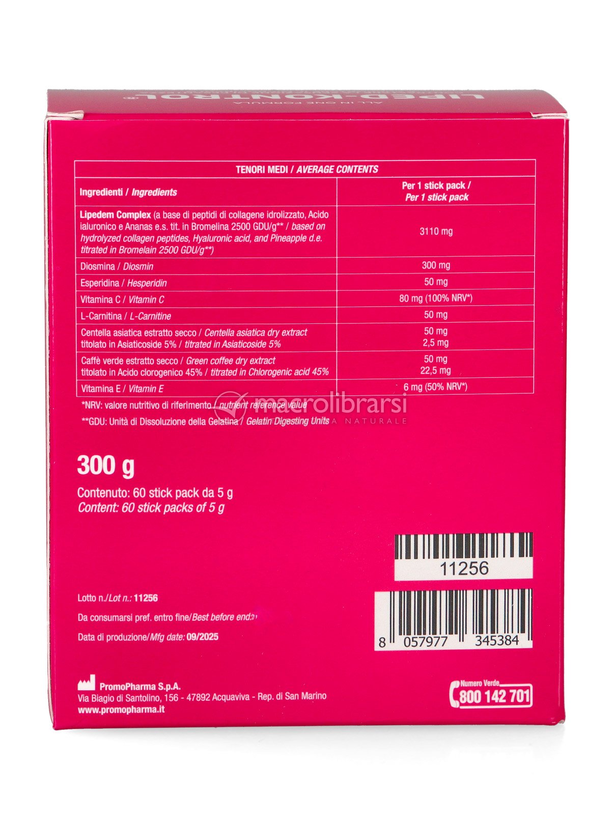 - Lipedem Complex, un complesso a base di peptidi di collagene idrolizzato, Acido ialuronico e Ananas e.s. tit. in Bromelina che favorisce il drenaggio dei liquidi corporei, alleviando la pesantezza delle gambe;