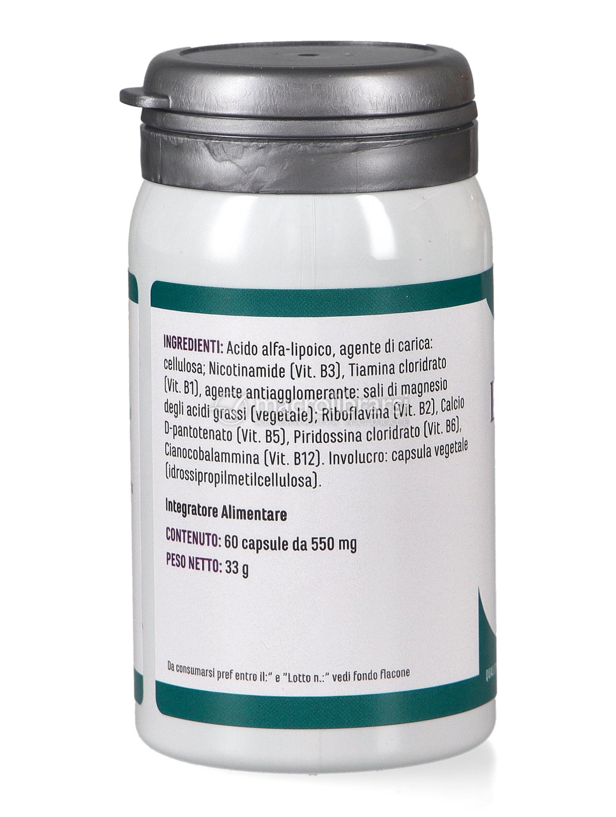 Acido alfa-lipoico, agente di carica: cellulosa; Nicotinamide (vit. B3), Tiamina cloridrato (vit. B1), agente antiagglomerante: sali di magnesio degli acidi grassi (vegetale); riboflavina (vitamina B2), calcio D-pantotenato (vitamina B5), piridossina cloridrato (vitamina B6), cianocobalammina (vitamina B12). Involucro: capsula vegetale (idrossipropilmetilcellulosa).