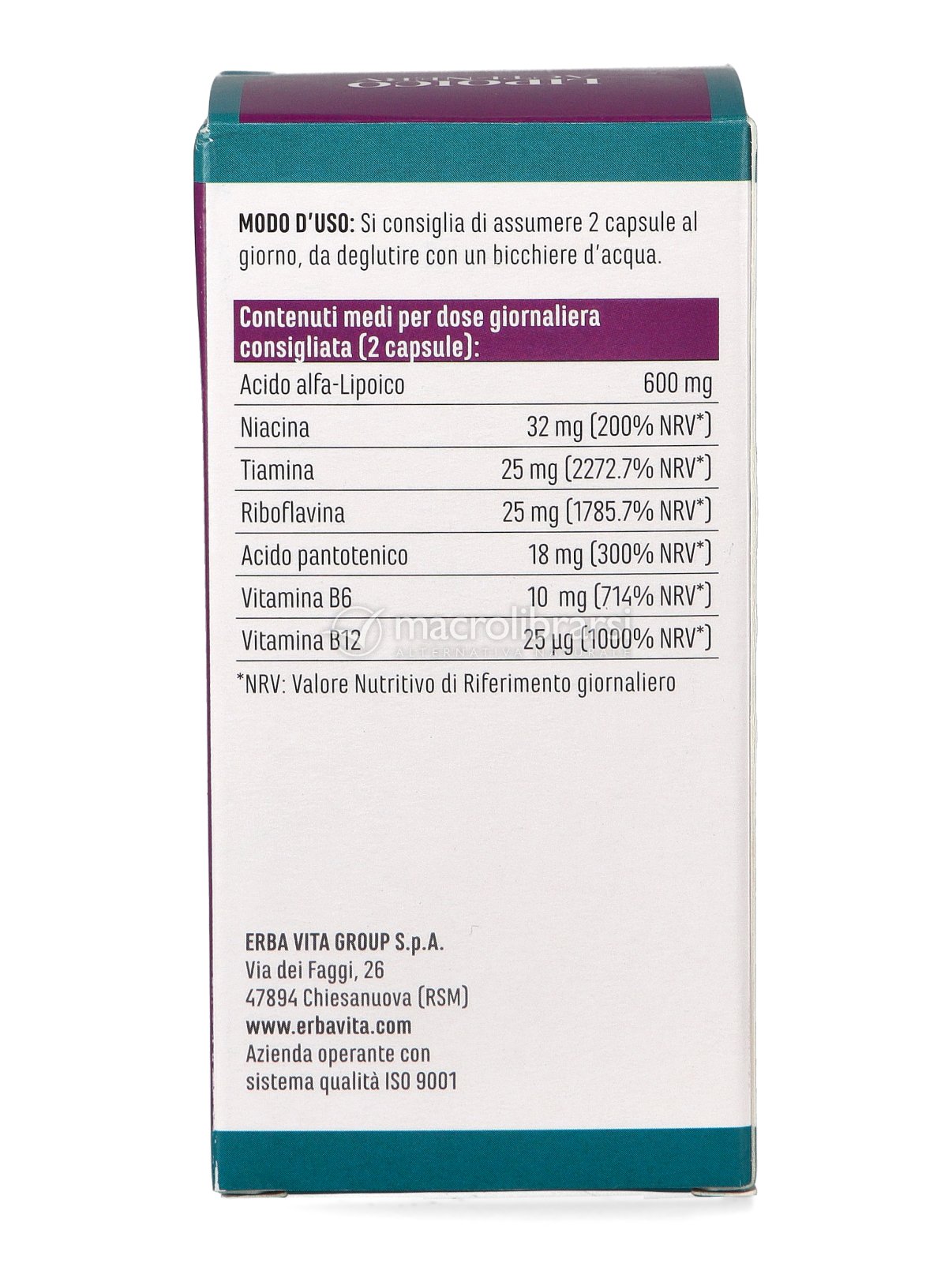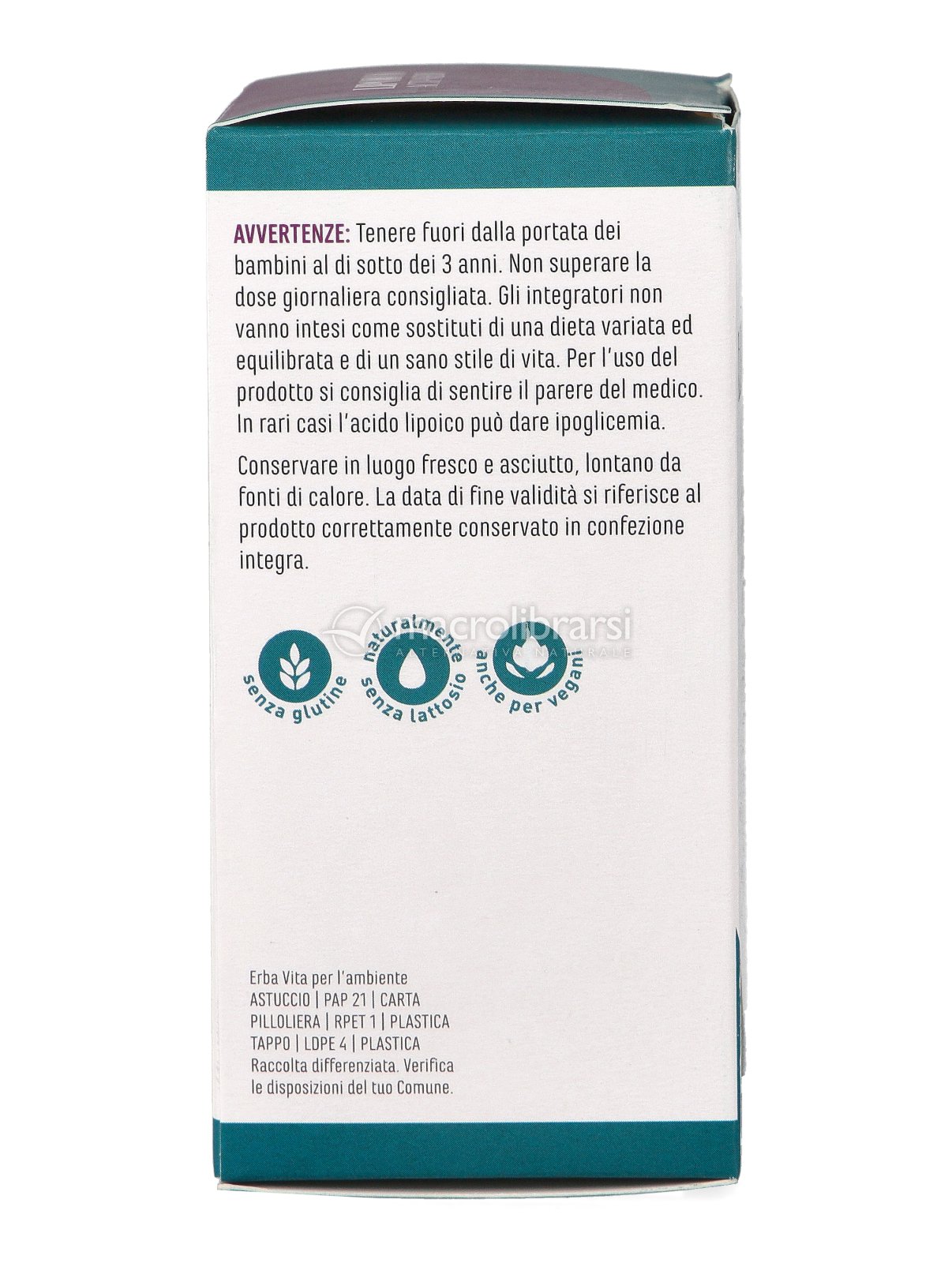 Avvertenze Tenere fuori dalla portata dei bambini al di sotto dei 3 anni. Non superare la dose giornaliera consigliata. Gli integratori non vanno intesi come sostituti di una dieta variata ed equilibrata e di un sano stile di vita. Per l’uso del prodotto si consiglia di sentire il parere del medico. In rari casi l’acido lipoico può dare ipoglicemia.