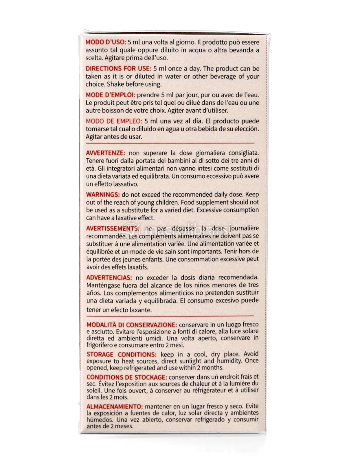 Si consiglia l’assunzione di 5 ml una volta al giorno. Il prodotto può essere assunto tal quale oppure diluito in acqua o altra bevanda a scelta. Agitare prima dell’uso.