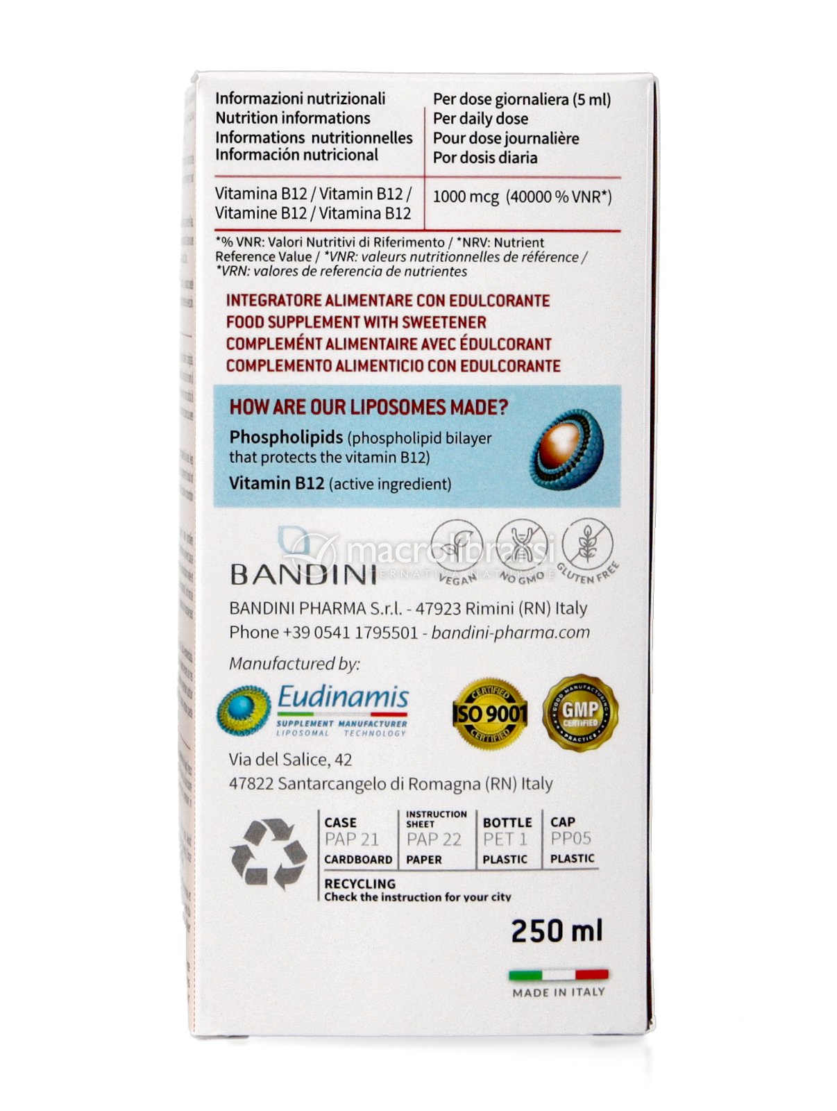 Liposomal Vitamin B12 di Bandini Pharma è un integratore alimentare a base di vitamina B12 (cianocobalamina) liposomiale liquida ad alto dosaggio e biodisponibilità. Viene prodotta con la tecnologia liposomiale, che forma una protezione attorno agli ingredienti attivi. I fosfolipidi, presenti anche nelle membrane cellulari, assicurano che gli ingredienti attivi siano protetti dall’ambiente acido dello stomaco e garantiscono l’assorbimento di questi ingredienti direttamente alle cellule.