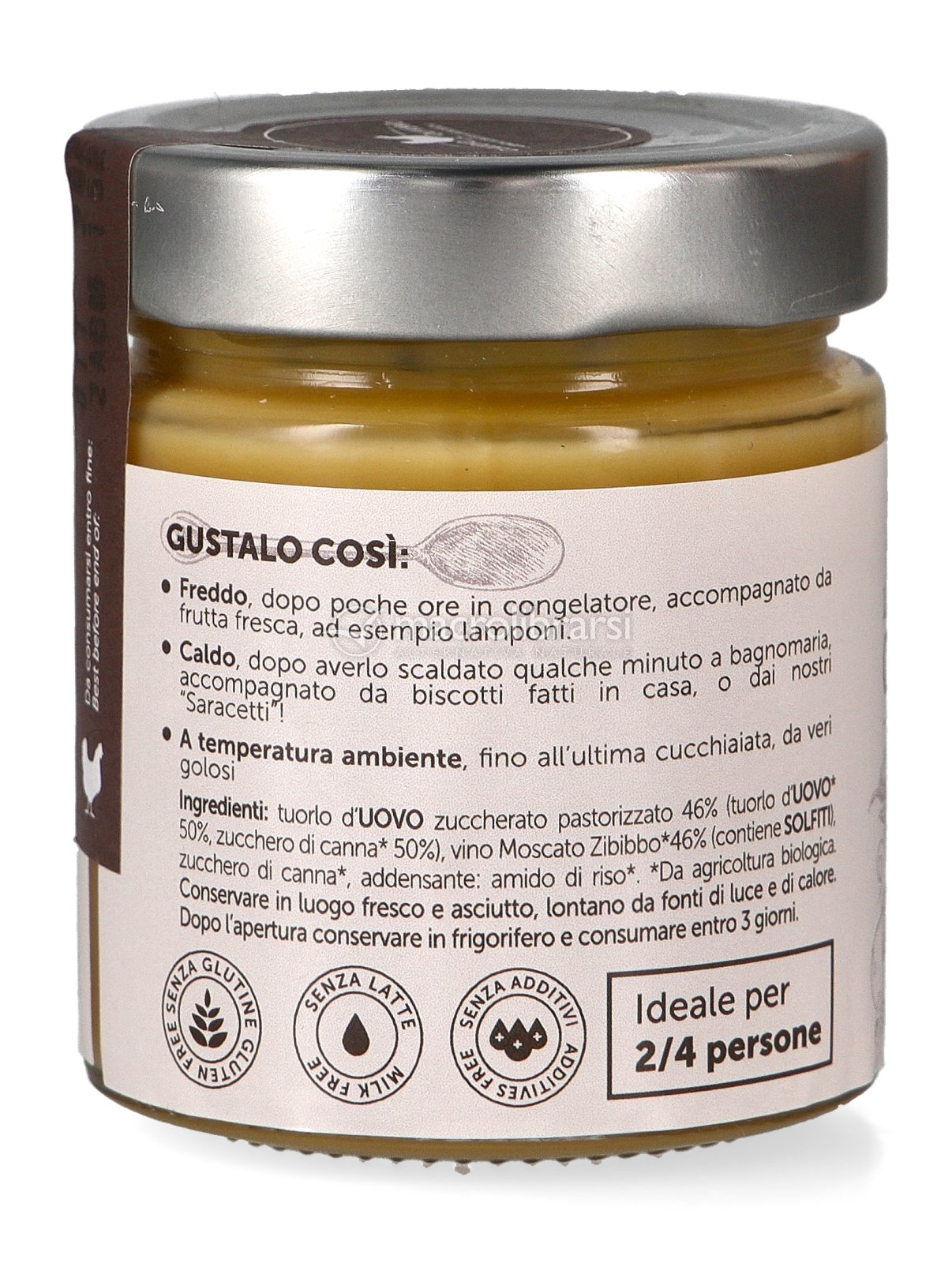 Ho acquistato questo zabaglione “Olivero” bio al vino moscato per regalarlo ad un amico celiaco amante dello zabaione; questo prodotto è gluten free e quindi va benissimo anche per lui. Lo ho confezionato con un fazzoletto di stoffa realizzato da me e un cordoncino rosso. Sono sicura che sarà un prodotto apprezzatissimo!