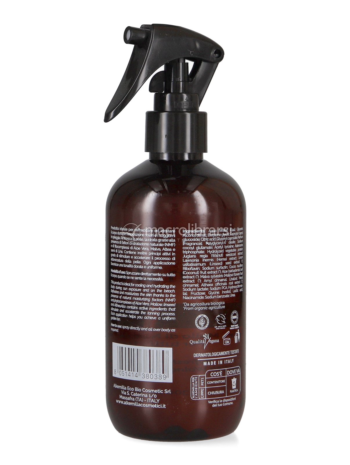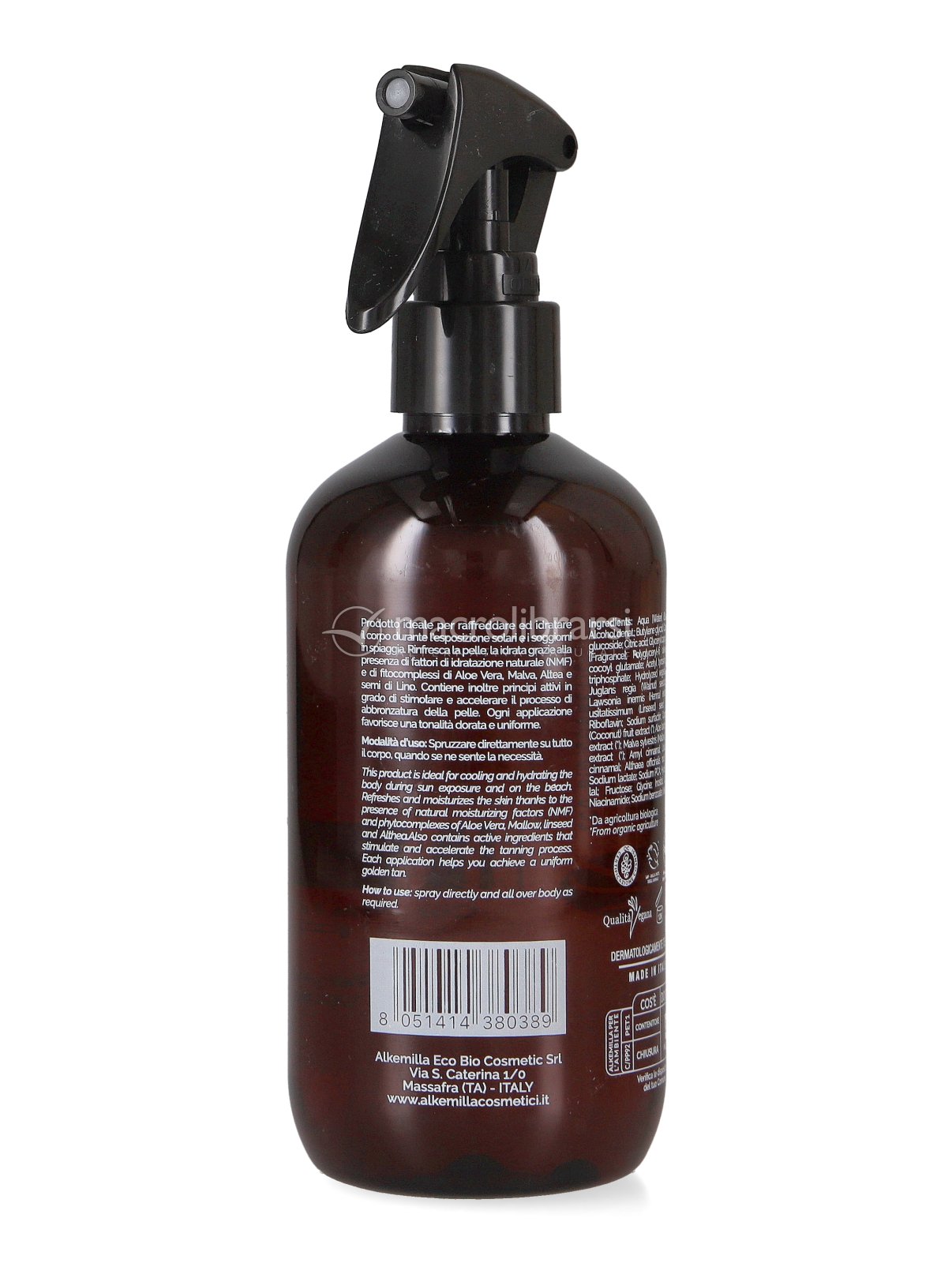 Rinfresca la pelle, la idrata grazie alla presenza di fattori di idratazione naturale (NMF) ei fitocomplessi di Aloe vera, Malva, Altea e semi di lino. Contiene inoltre principi attivi in grado di stimolare e accelerare il processo di abbronzatura della pelle.