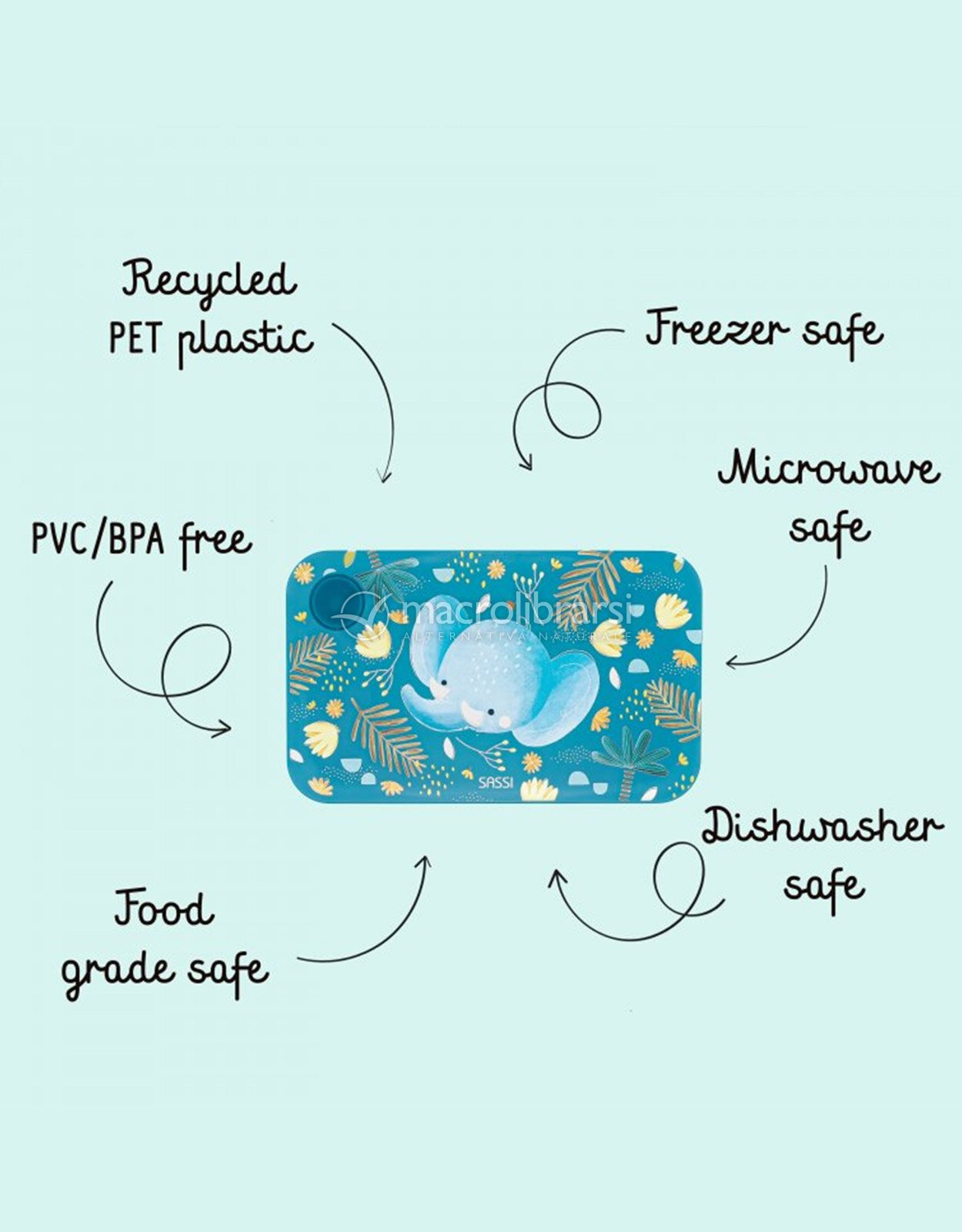 Lunch box in pet riciclato, decorata con le divertenti immagini dell' Elefante Chewy.