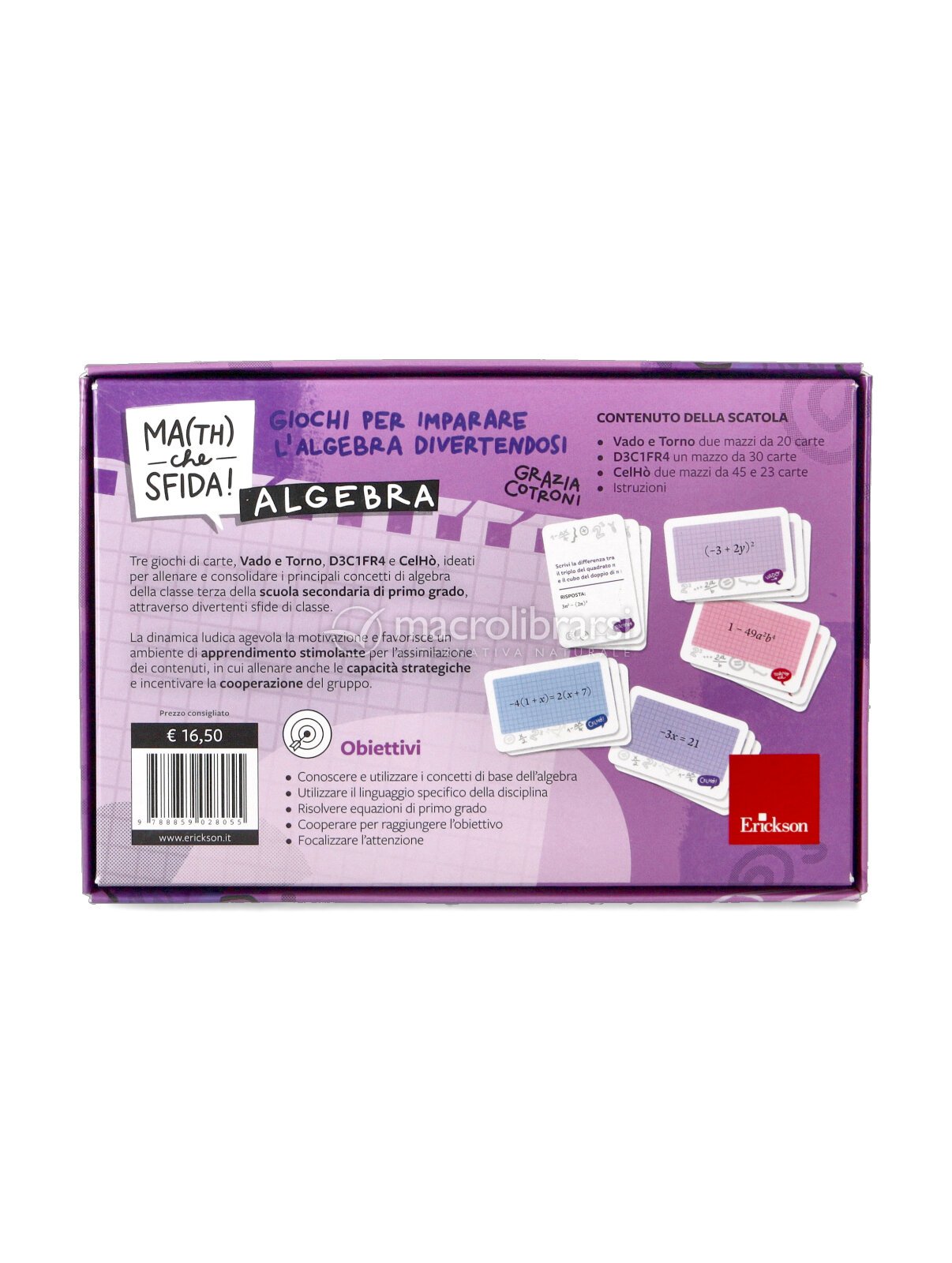 In un'unica scatola tre originali giochi per allenare e consolidare i principali concetti di algebra della classe terza della scuola secondaria di primo grado attraverso divertenti sfide di classe.