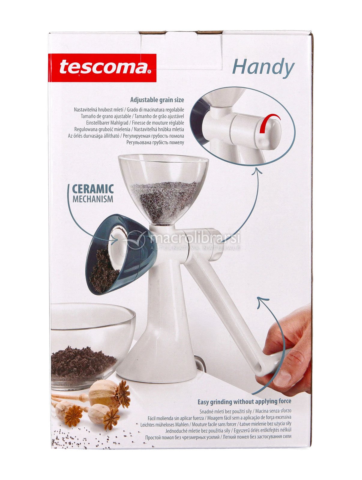 Grazie al meccanismo regolabile in ceramica, puoi scegliere una macinatura fine o più grossolana in base alla ricetta e alle tue preferenze. È l’alleato perfetto per preparare facilmente farina di semi di lino, farina di sesamo e altre miscele da aggiungere a insalate, zuppe, verdure, tartine, stuzzichini e prodotti da forno.