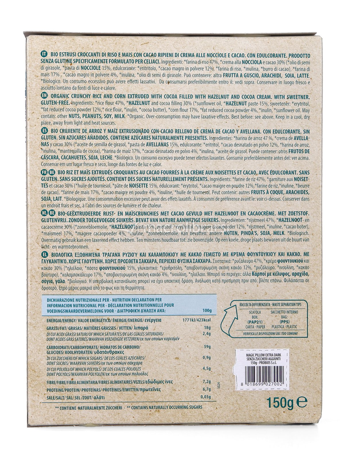 Magic Pillow Extra Dark sono estrusi croccanti di riso e mais con cacao, ripieni di crema alle nocciole e cacao, ottimi per la prima colazione!