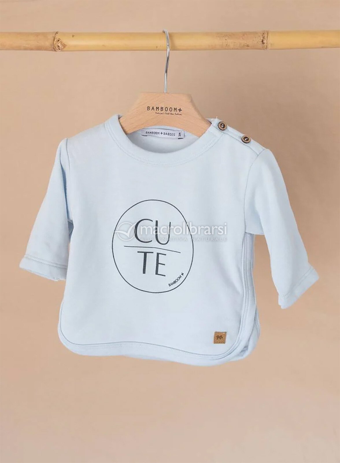 Maglia felpata in bambù organico, azzurra e con dolcissima scritta "Cute" sul davanti.