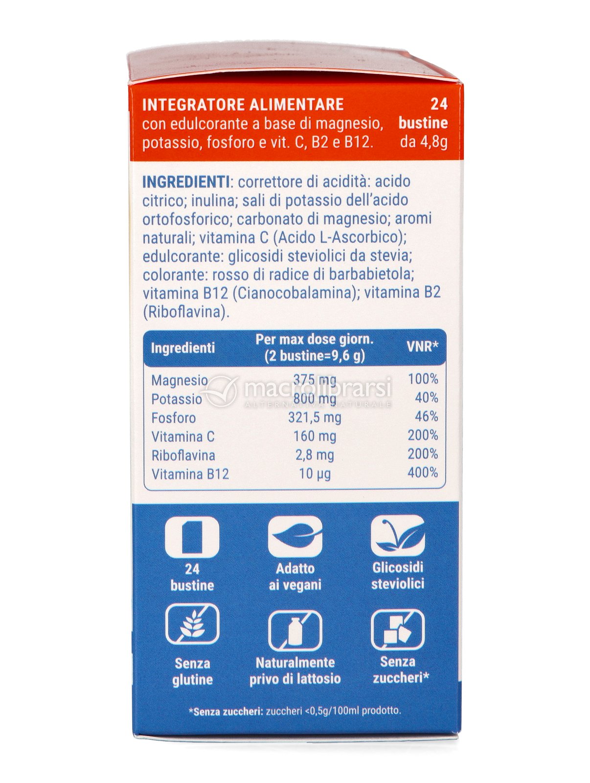 Contribuisce al normale metabolismo energetico, sostiene la normale funzione muscolare e supporta il sistema nervoso, contrastando la stanchezza sia fisica che mentale.