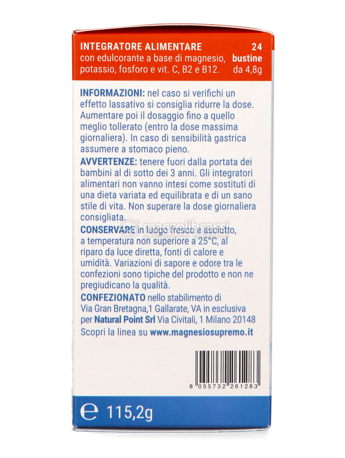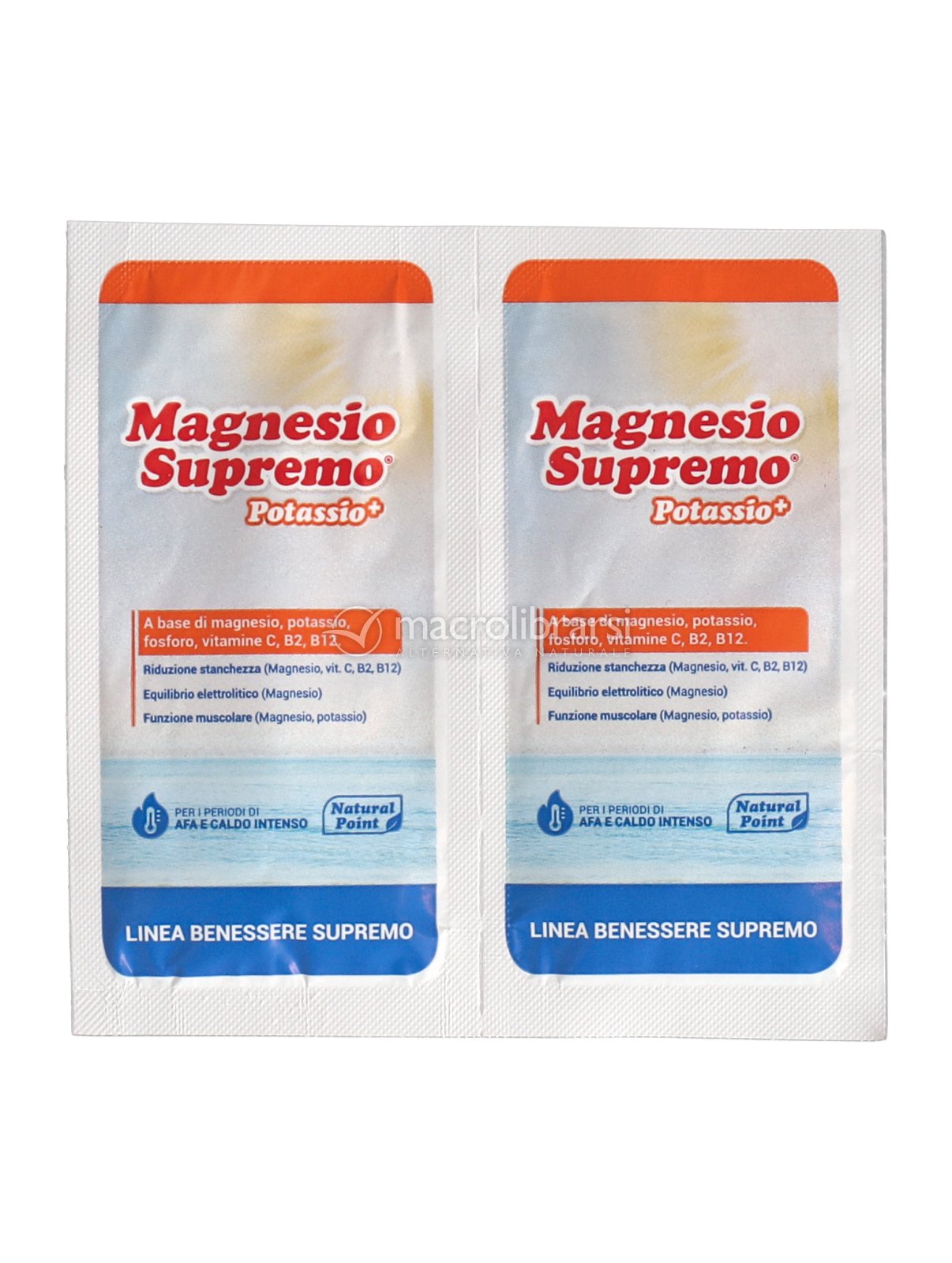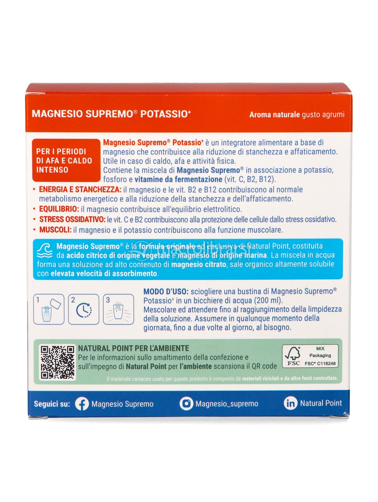 Magnesio Supremo® Potassio+ di Natural Point è un integratore a base di magnesio, a cui si aggiungono potassio e fosforo, minerali importantissimi per il metabolismo energetico e muscolare.