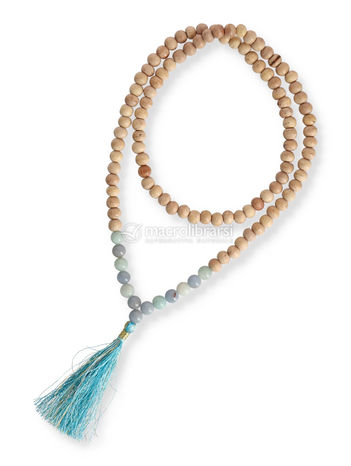 Una mala in Tulsi con Angelite e Amazzonite utile per la meditazione e la preghiera.