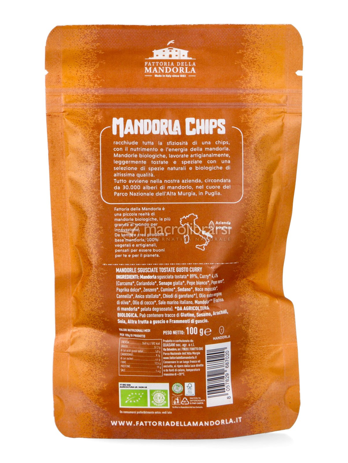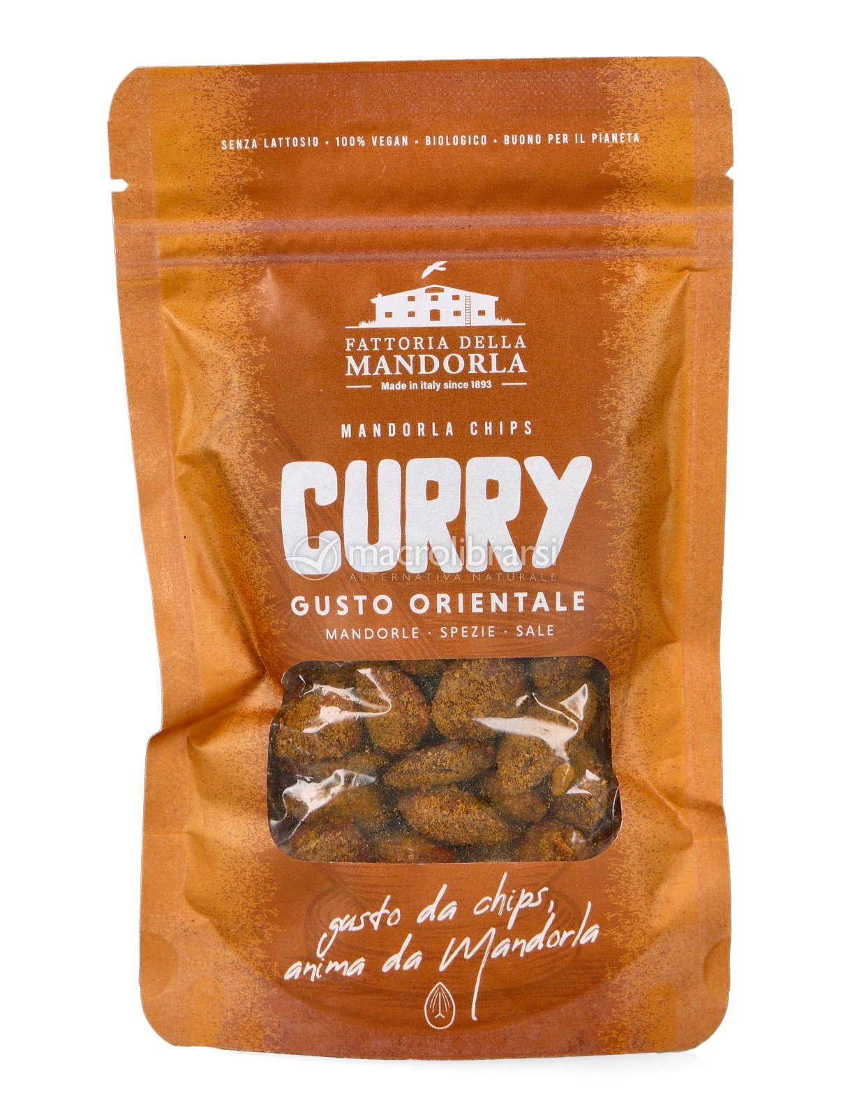 Mandorle tostate biologiche arricchite con un mix di spezie curry bio. Uno snack croccante e aromatico, perfetto per chi ama i sapori intensi e speziati.