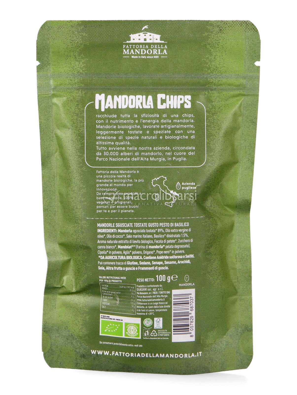 Le Mandorla Chips Pesto di Basilico BIO della Fattoria della Mandorla trasformano la semplicità della mandorla in uno snack croccante dal carattere mediterraneo. Le mandorle, leggermente tostate, si arricchiscono dei profumi intensi del basilico e delle erbe aromatiche, dando vita a un equilibrio perfetto tra gusto e naturalità.