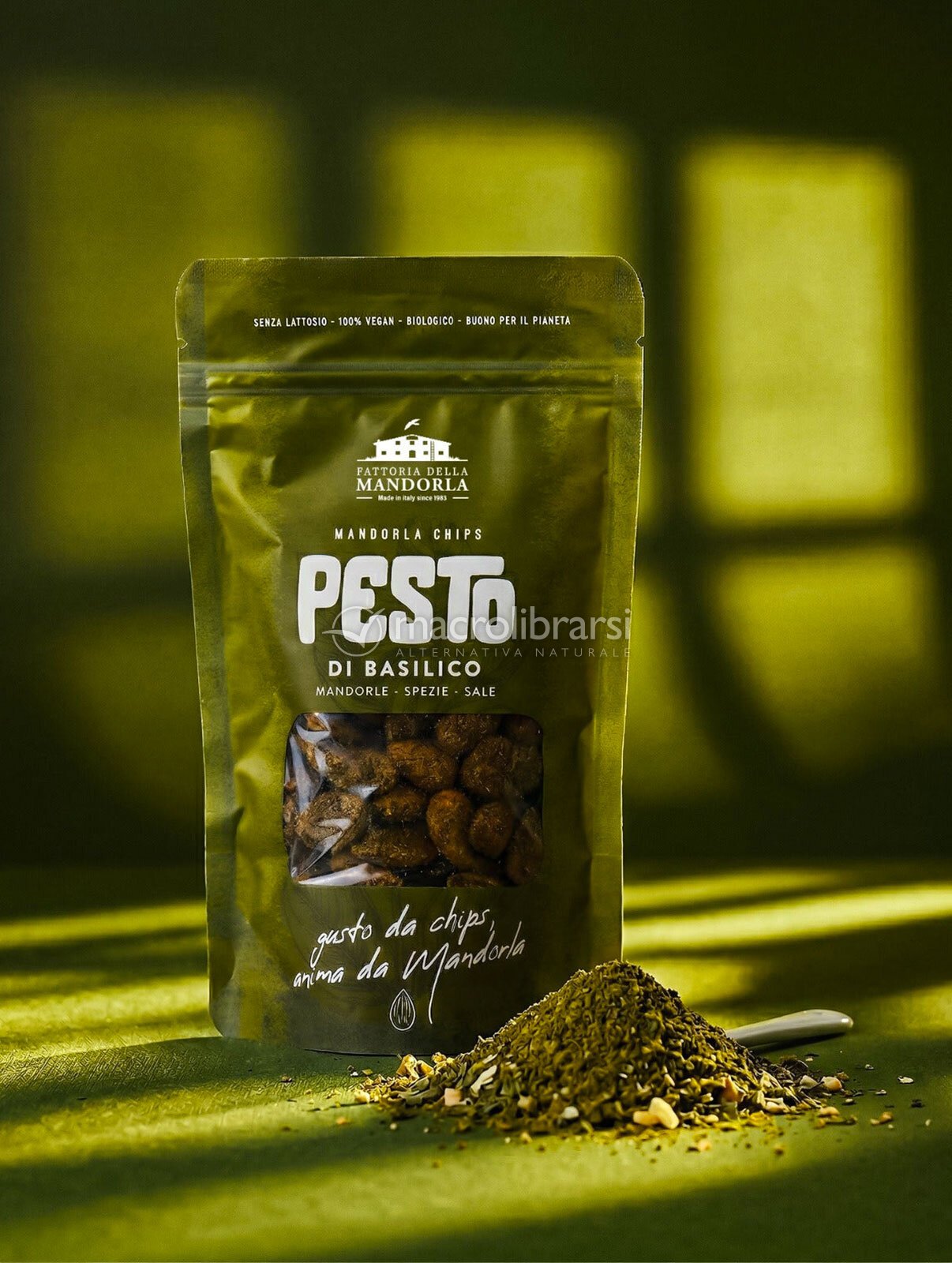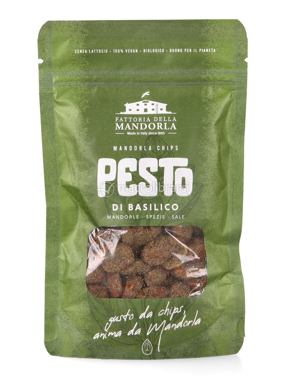 Croccanti chips di mandorle bio al pesto di basilico, con erbe aromatiche e olio extravergine di oliva: perfette per dare gusto ai tuoi aperitivi.