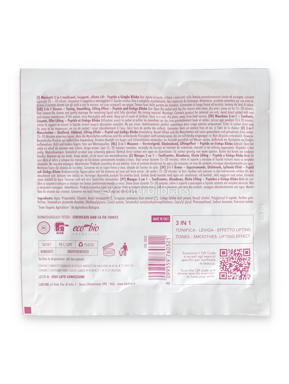 Sono manicotti in tessuto pronti all'uso, imbevuti di una formula urto che combina l'azione rimodellante della compressione alla potenza dei peptidi per braccia subito più sode e levigate.