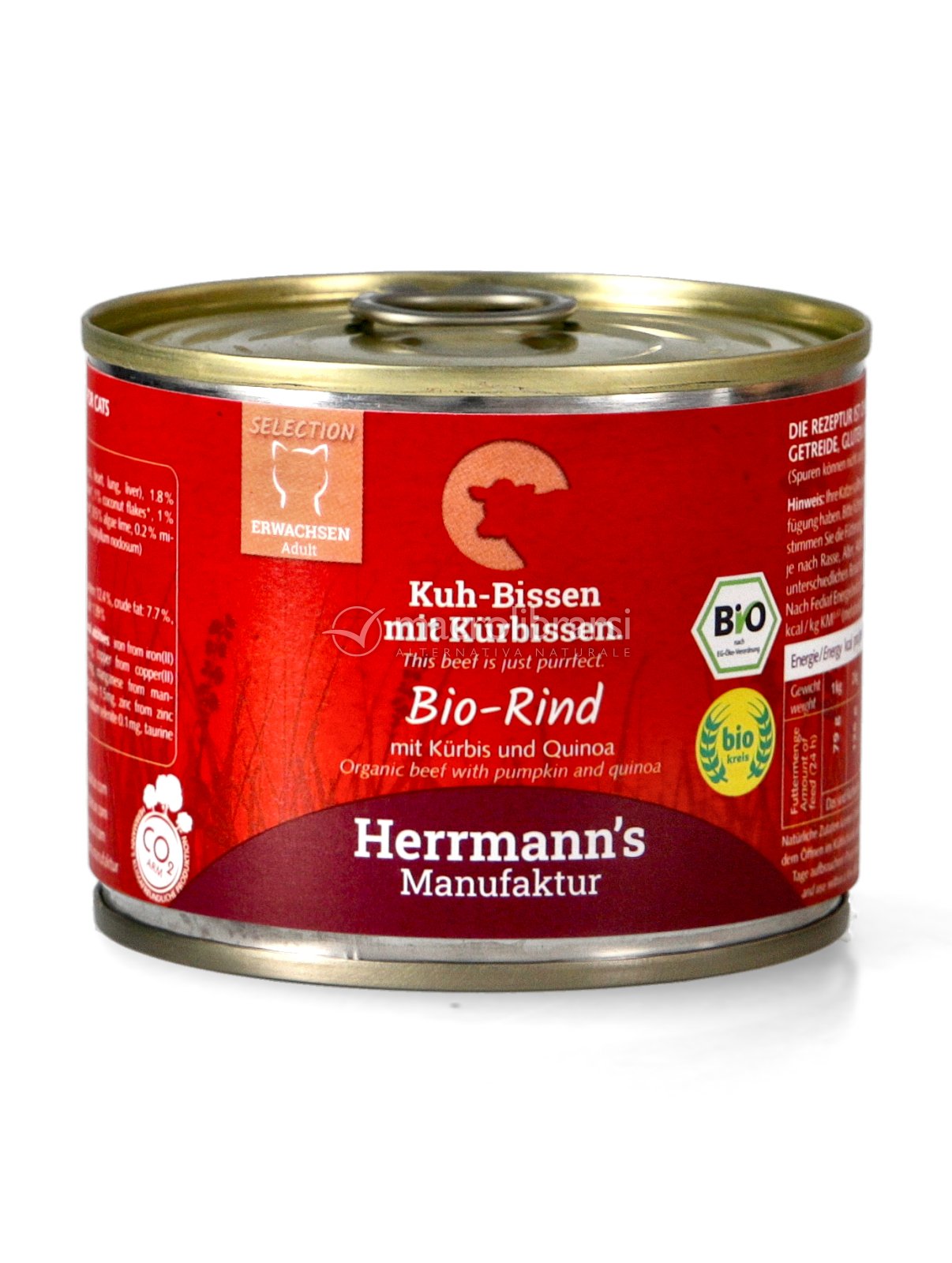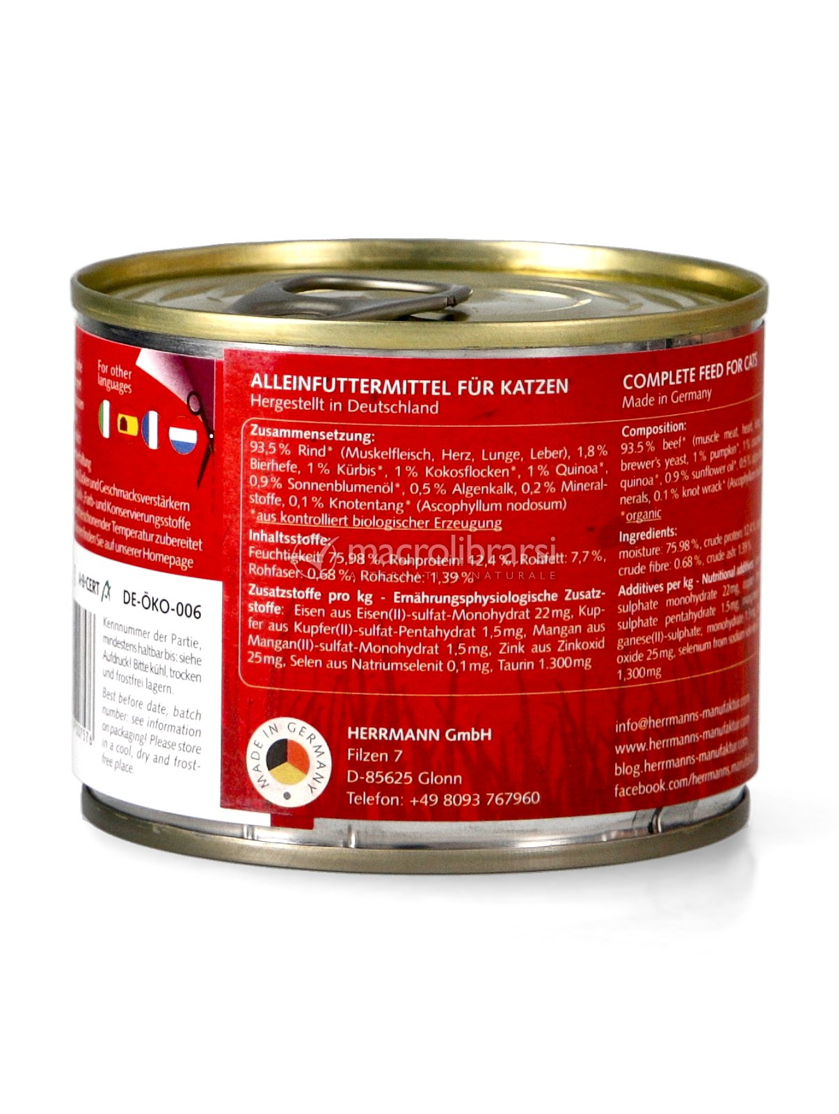 Acquisto dal 2014 i prodotti per gatto di questa ditta tedesca e l'ho sempre considerata la migliore in assoluto sul mercato, non solo per la qualità bio degli ingredienti (credo sia stata la prima a proporla per i nostri animali domestici), ma anche per la giustezza delle scelte negli abbinamenti, la presentazione di mix vegani di verdure e frutta e l'esclusione di ingredienti sia pure salutari, ma ostici al palato di cani e gatti. Purtroppo all'inizio ho molto faticato a far accettare alla mia gatta di allora Hermann's bio Rind perché la ricetta era molto ricca di grasso, probabilmente studiata per gatti abituati al clima della Germania. Il bio Rind odierno è più leggero e appetibile per il mio gatto Carlo e per Camillo (ospite fisso). E' stato apprezzatissimo e ne sono molto contenta perché i prodotti della Hermann's sono, come poche altre marche sul mercato, prive di manipolazioni e rimpasti che rendono l'alimento troppo commerciale. Inoltre sono confezioni da 100 grammi non da 75/85 come altre ditte.