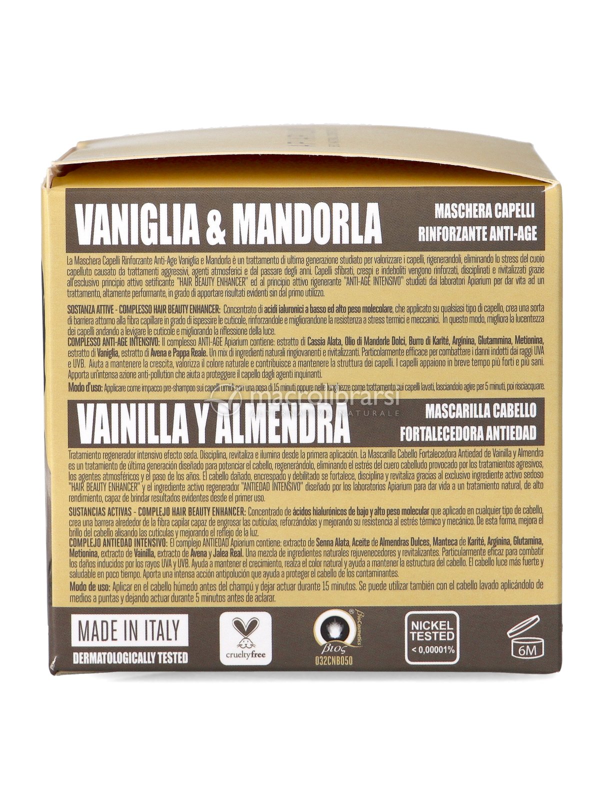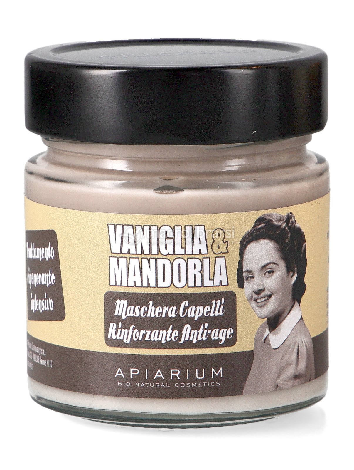 Con l'applicazione della Maschera Capelli Anti-Age Vaniglia e Mandorla, i capelli vengono rinforzati, disciplinati e rivitalizzati grazie all’esclusivo principio attivo setificante Hair Beauty Enhancer ed al principio attivo rigenerante Anti-Age Intensivo studiati dai laboratori Apiarium per dar vita ad un trattamento bio, altamente performante, in grado di apportare risultati evidenti sin dal primo utilizzo.