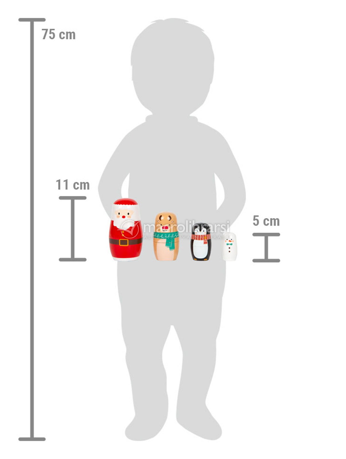 Quattro matrioske con personaggi natalizi in legno (Babbo Natale, una renna, un pinguino, un pupazzo di neve) che si possono mettere l'uno dentro l'altro.