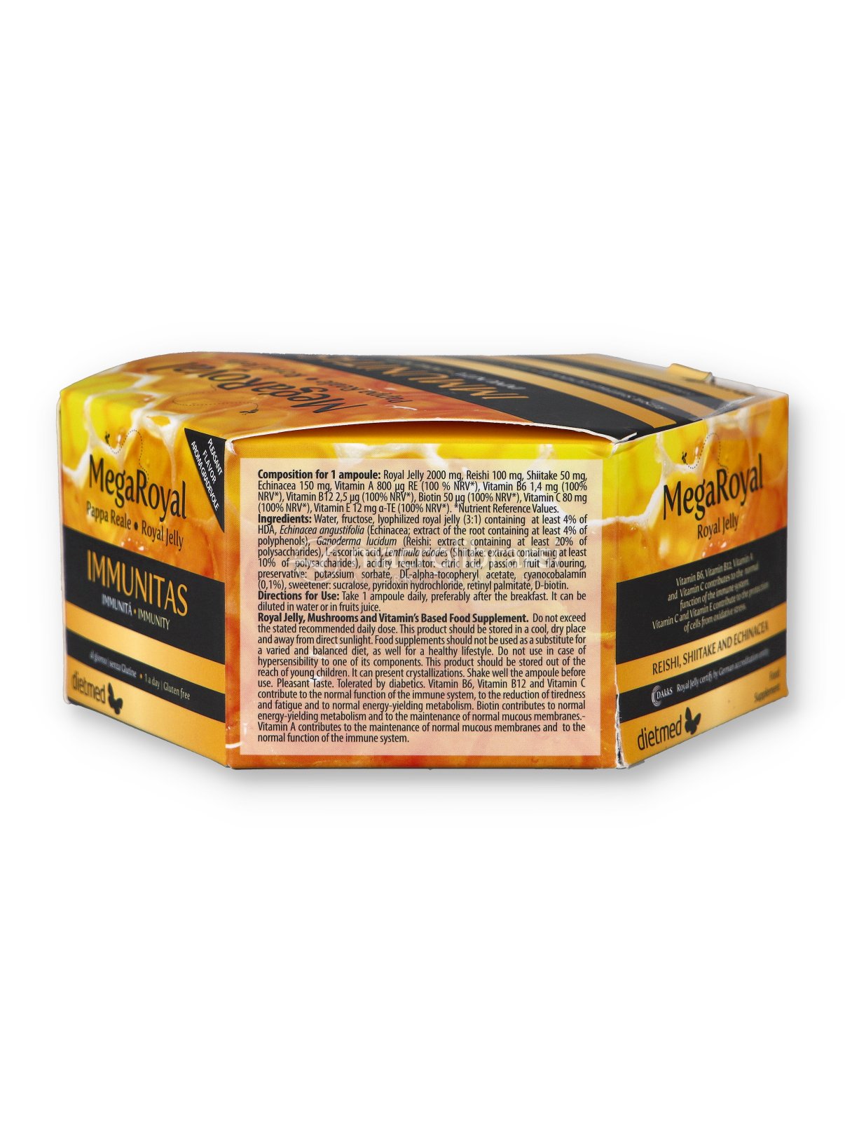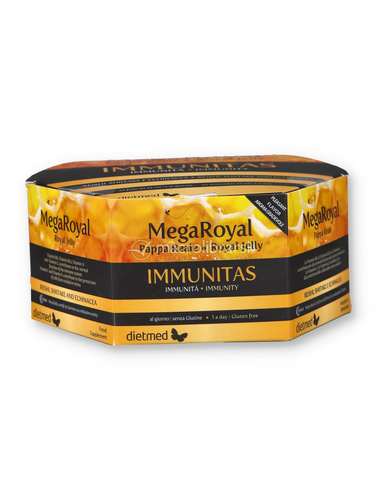 MegaRoyal IMMUNITAS unisce la forza della pappa reale, il contributo benefico dei funghi medicinali e l’azione mirata delle vitamine per offrire un supporto completo al tuo organismo. È pensato per chi desidera rinforzare le naturali difese, contrastare la stanchezza e affrontare con più vitalità i periodi di maggiore stress o cambi di stagione.