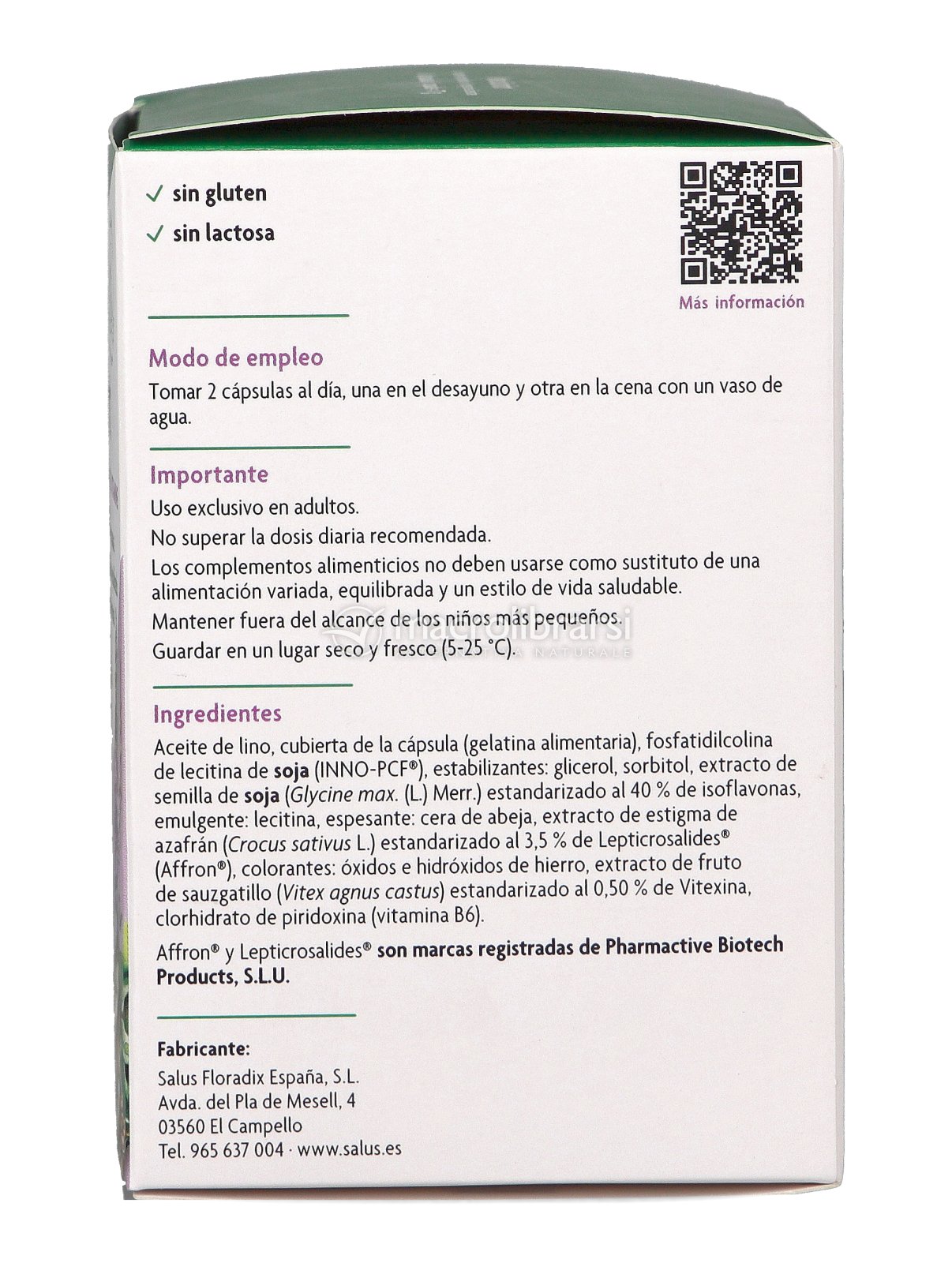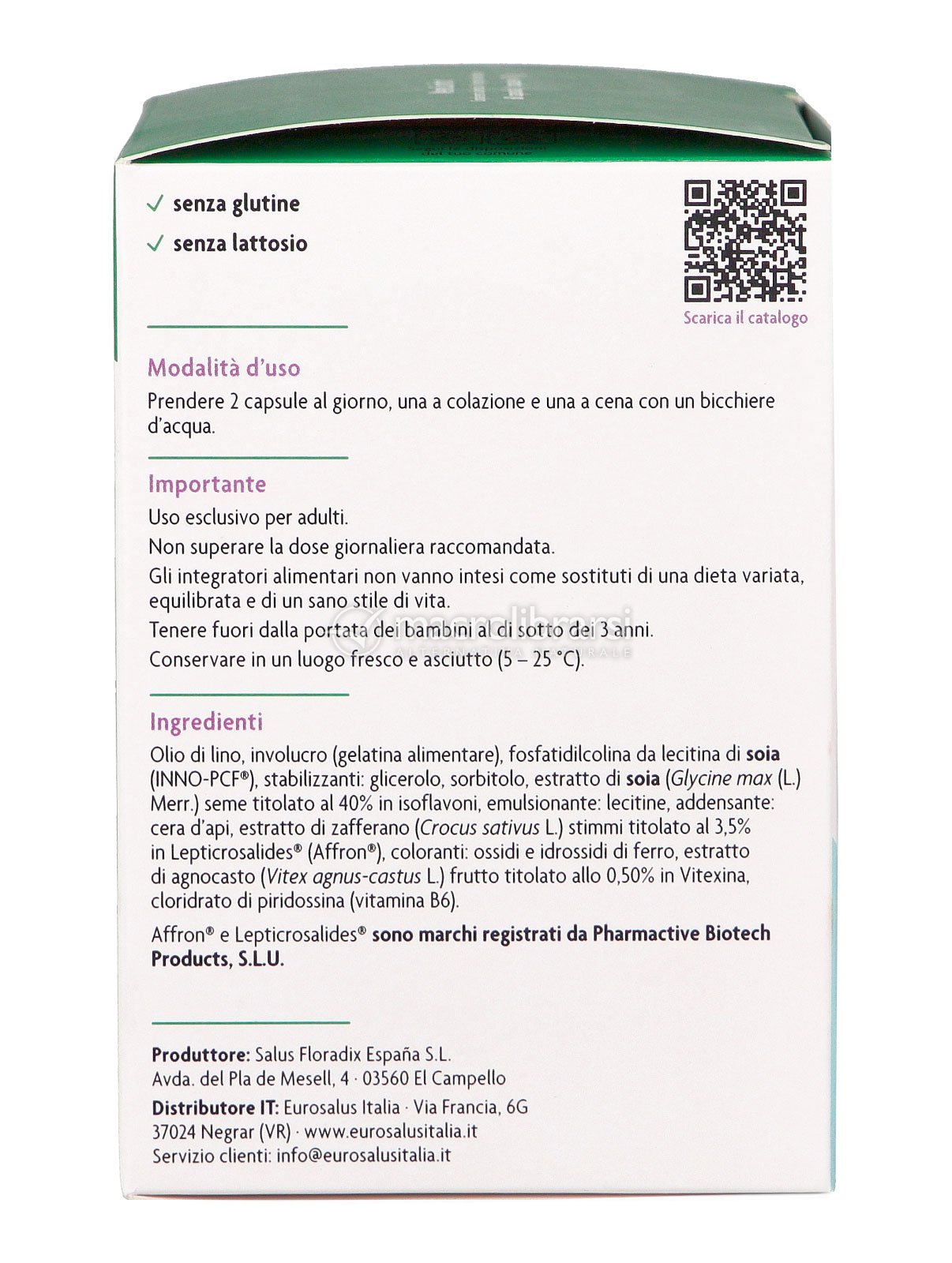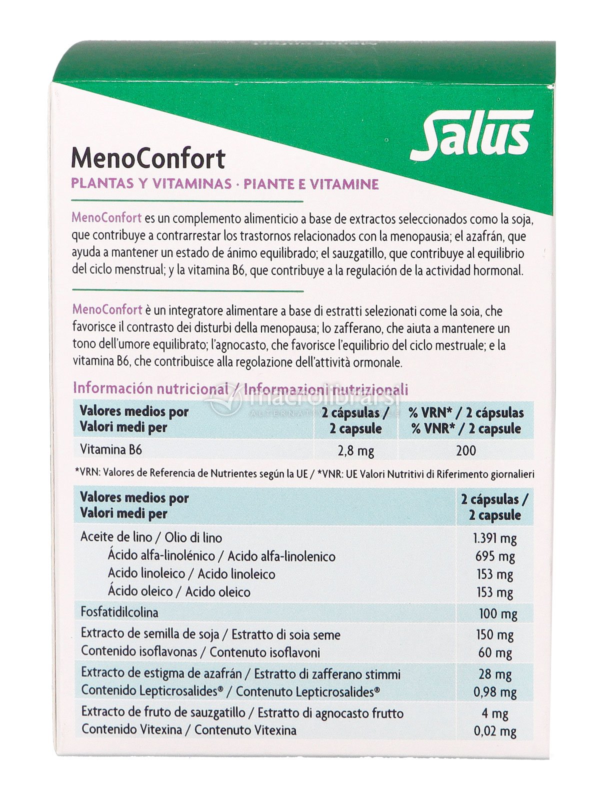 Contiene: soia, che contribuisce al benessere della donna durante la menopausa e la premenopausa; lo zafferano, che aiuta a mantenere un tono dell’umore equilibrato; agnocasto, che favorisce l’equilibrio del ciclo mestruale; e la vitamina B6, che contribuisce alla regolazione dell’attività ormonale.