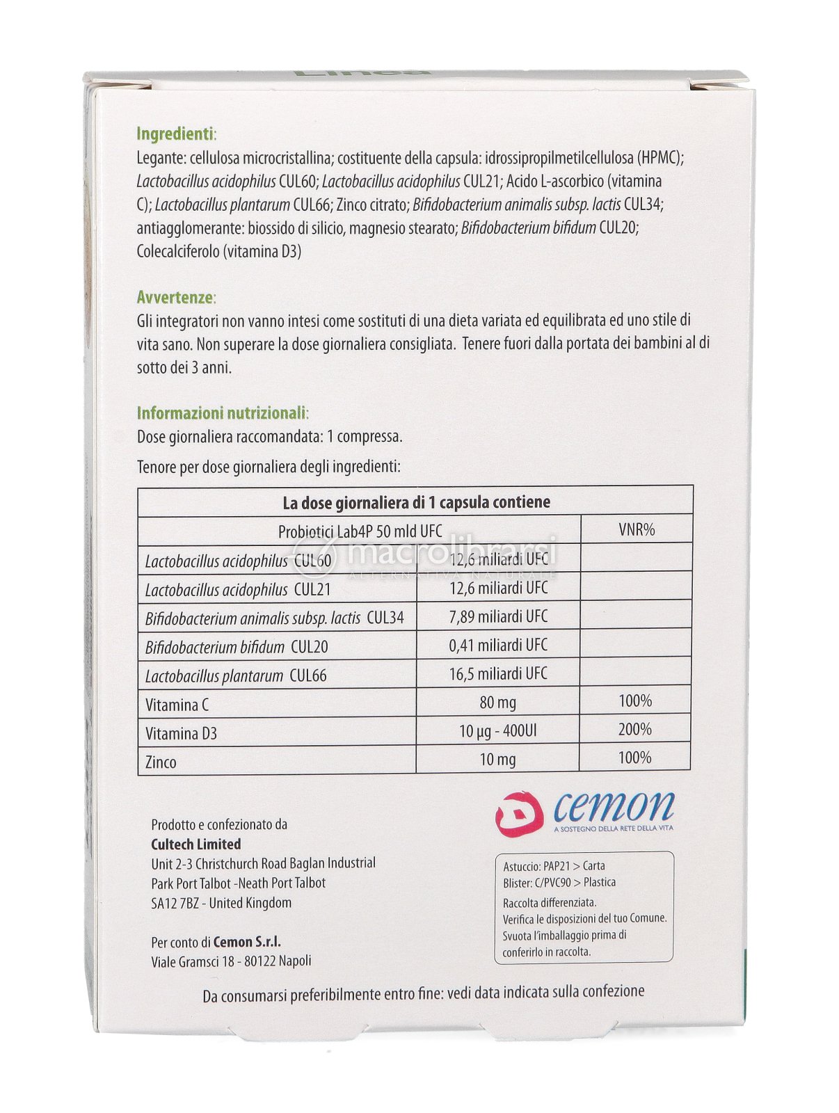 | Disclaimer | Non superare la dose giornaliera consigliata. Gli integratori alimentari non vanno intesi come sostituti di una dieta variata ed equilibrata. Tenere fuori dalla portata dei bambini al di sotto dei tre anni. Non utilizzare in gravidanza e nei bambini o comunque per periodi prolungati senza sentire il parere del medico. Conservare in luogo asciutto e lontano da fonti di calore. Richiudere la confezione dopo l'uso. Macrolibrarsi ricorda l'importanza di seguire uno stile di vita sano e un'alimentazione variata ed equilibrata. |