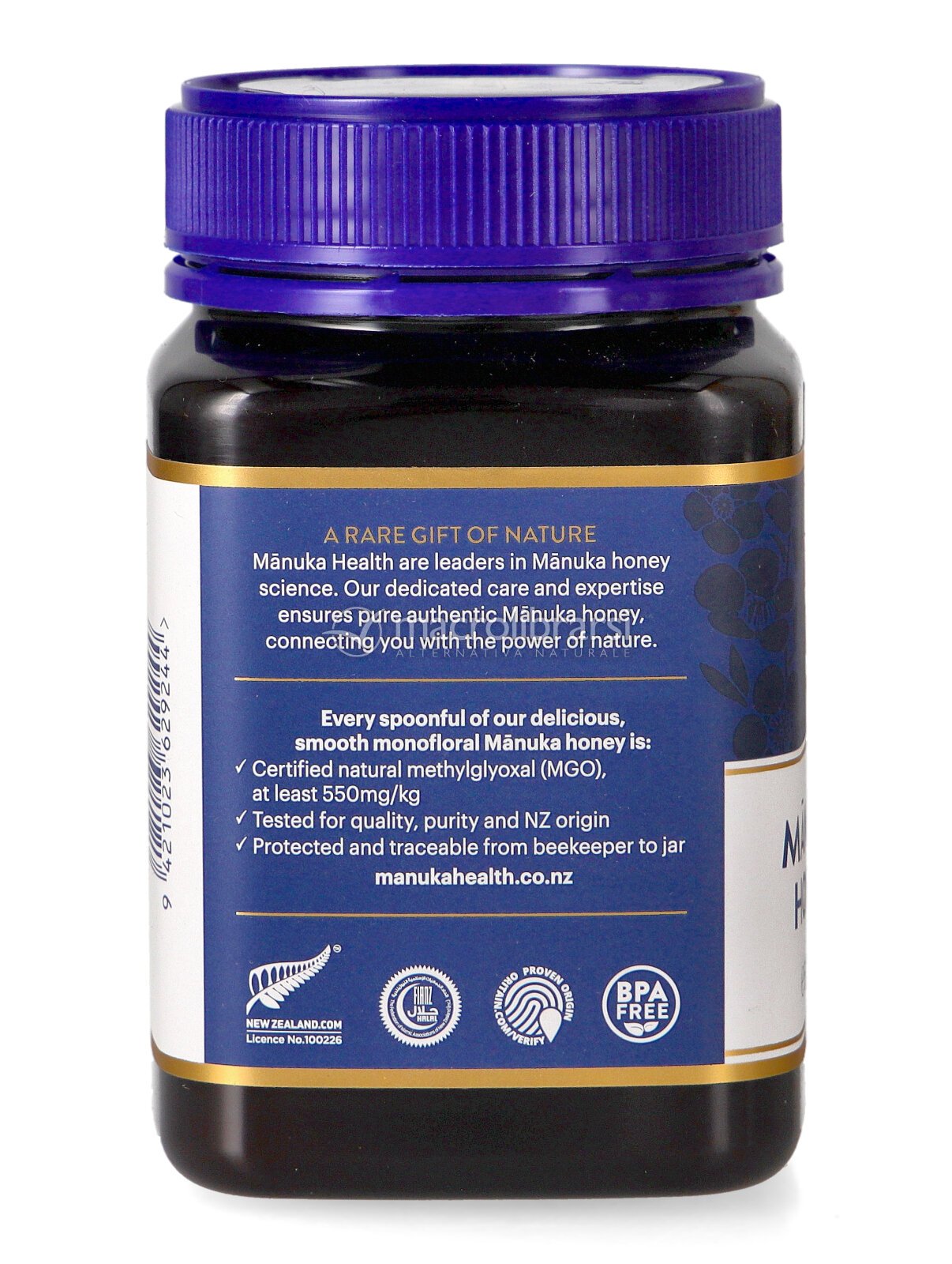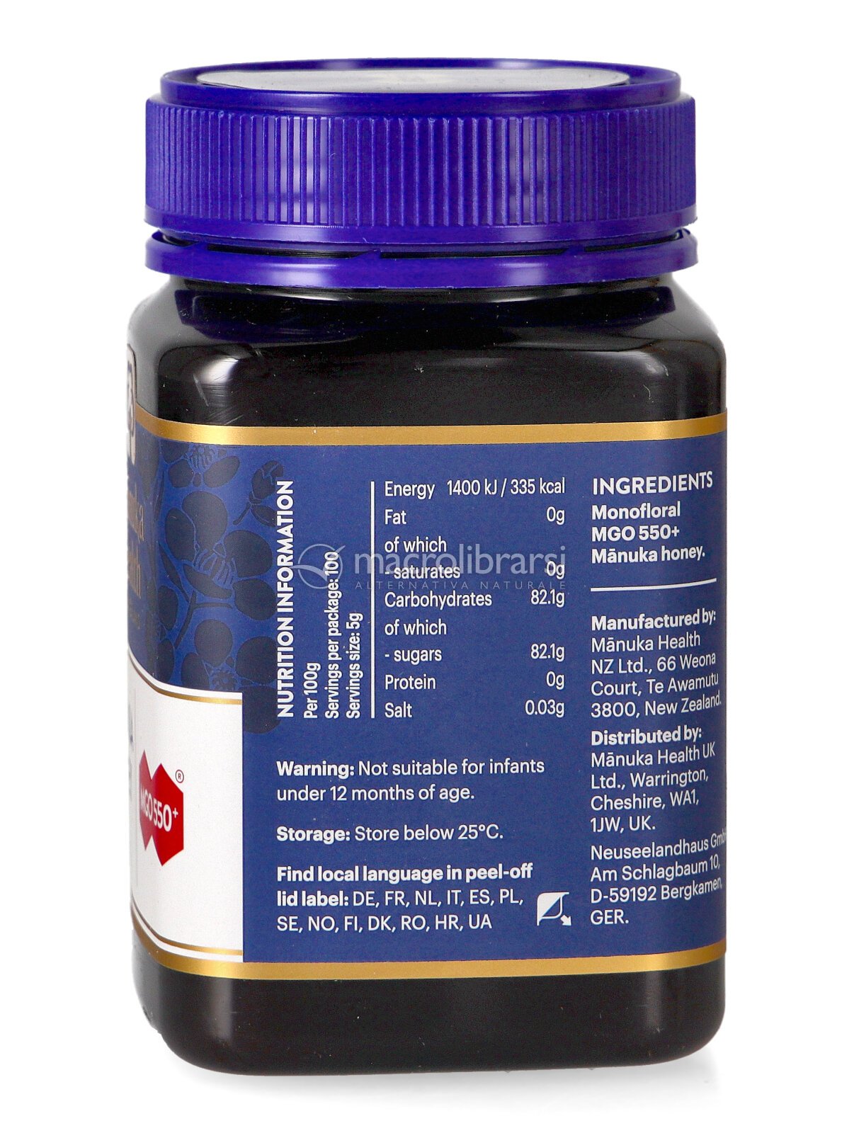 Questa confezione del miele di manuka contiene 550 MGO (MethylGlyOxal), ossia 550 mg di Metilgliossale per chilo di miele. Ha efficacia terapeutica molto potente, per cui è bene non abusarne, ma usarlo in caso di necessità.