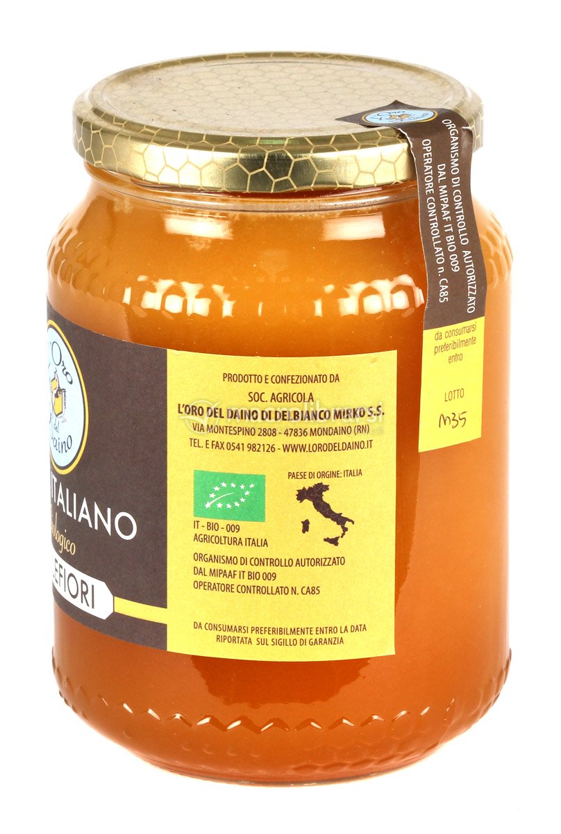 Questo miele millefiori proviene da api allevate in Italia e da agricoltura biologica.