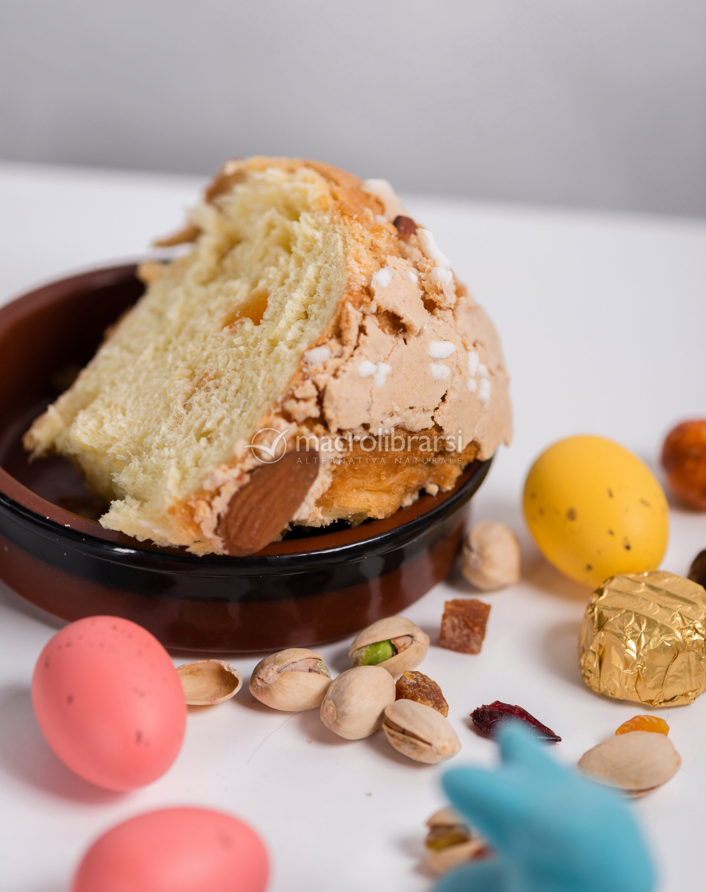 Il piccolo dolce Pasquale senza glutine, stupisce per il proprio impasto soffice e fragrante e l’inconfondibile profumo tipico dei dolci lievitati. la glassa è realizzata con zucchero di canna, farina di mandorle e mandorle intere per decorare e aggiungere croccantezza. Fibra di semi di psillio Plantago psyllium migliora la consistenza dell'impasto e la lievitazione.